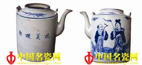 值得注意的是,这把壶的肩部绘有兰竹纹饰,这是清朝嘉庆道光时期青花瓷上的传统纹饰;再则,在寿星麻姑的脚下绘有“鱼眼”云纹,尽管画得十分草率,很容易使人联想雍正乾隆的青花瓷上的云纹画法。这些信息提示我们,清朝、民国、新中国初期的青花瓷某些纹饰出现的“错位”,有可能给我们的鉴赏带来误导。