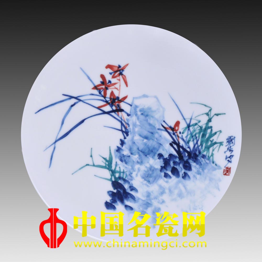 在古人眼里,兰为美人,即品行非常完美的人。从而成为文人画中最受欢迎的题材,空谷幽兰,兰最让人敬佩之处是其“幽”,独居幽谷,与世无争,洁身自好。画兰时,下笔要简洁,明快,过程中要有转折,这样才能表现兰花的优雅翻折的姿态。在景德镇陶瓷艺术家吴国兴的《兰吐幽香》中,便描绘了这幽幽兰花。在画中,描绘了在山石之上草丛中挺立的几朵兰花,细弱的枝干之上,朵朵花瓣迎风飘拂,近旁绘了几丛绿茵杂草,再加上此画以青花色调配色,更衬托的兰花淡雅清香。