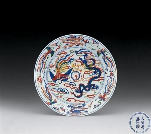 万历五彩 与嘉靖五彩一样,万历五彩也是久负盛名。官窑烧制的主要是青花五彩瓷,也有一些单纯的釉上五彩(由于主要是红、绿、黄三色,以色釉为地,因此也被一些人称之为万历三彩)。