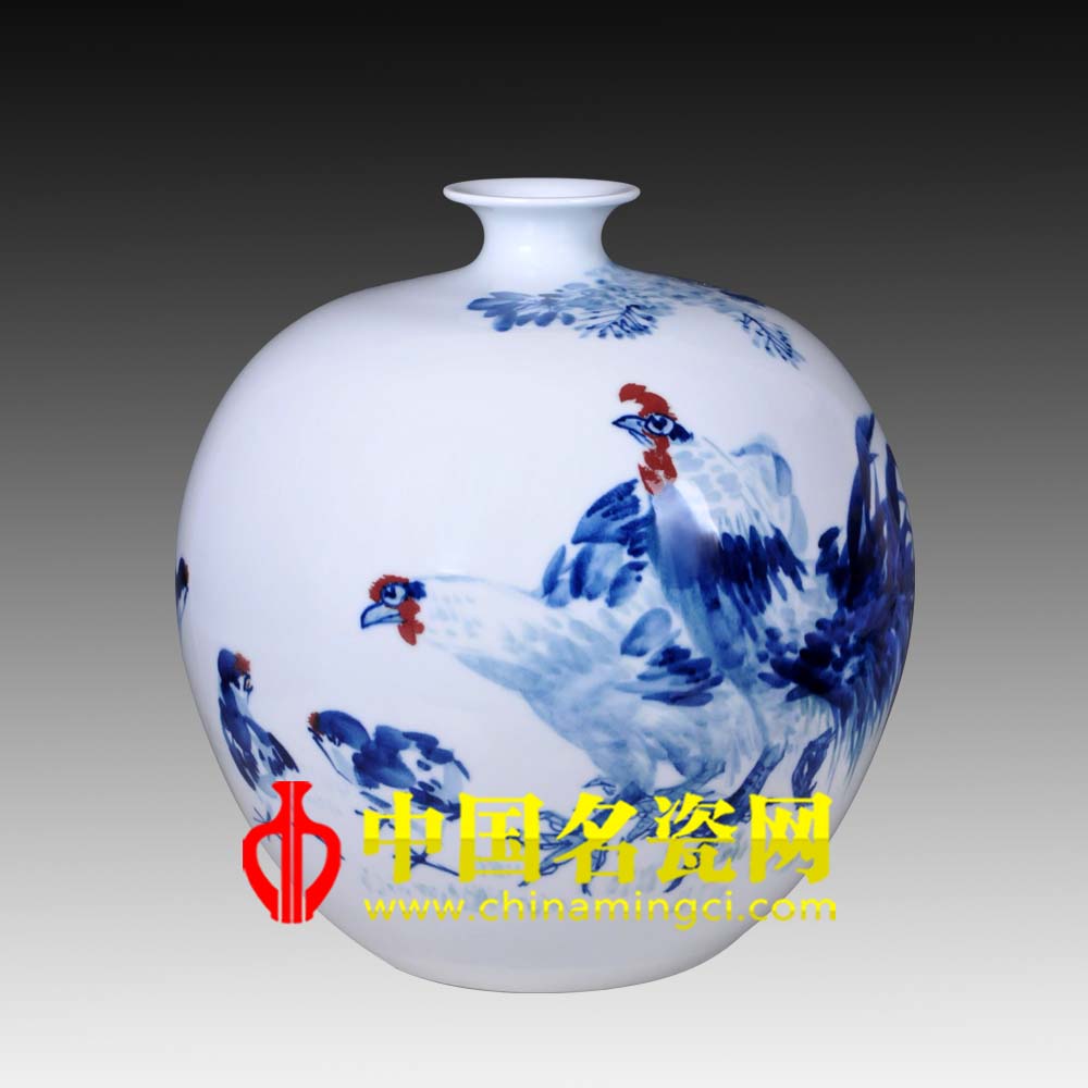 吴国兴老师擅长釉下彩装饰,其青花作品结合国画艺术,让人耳目一新。作品描绘春光明媚的庭院一偶,盛开的紫藤树下,一只雄鸡信步闲庭,器宇轩昂,红冠锦羽,旁边一只母鸡带领几只小鸡,觅食嬉戏,几只小东西或动或静,形象生动,作品用笔简洁、技法娴熟,惟妙惟肖,传情达意。结合瓷器本身饱满的器型,晶莹的釉色,青花发色湛蓝青翠,是一件非常赏心的陶瓷精品。“鸡”谐“吉”,喻指大吉大利。且鸡是五德之禽,具备“文、武、仁、勇、信”,人们常说的功名富贵,世上大吉,官上加官等等都是和鸡相关的,所以这又是一件寓意非常吉祥的作品。