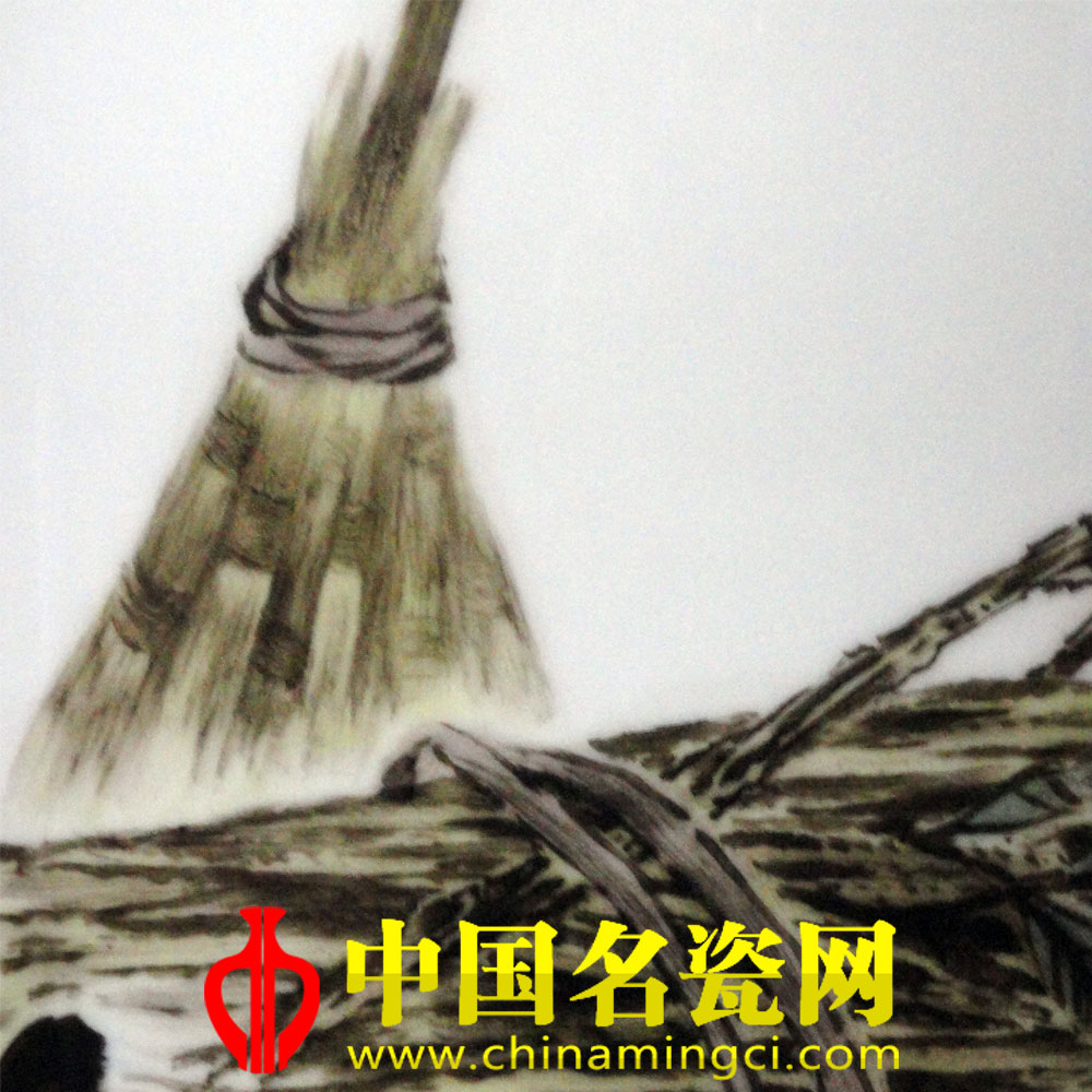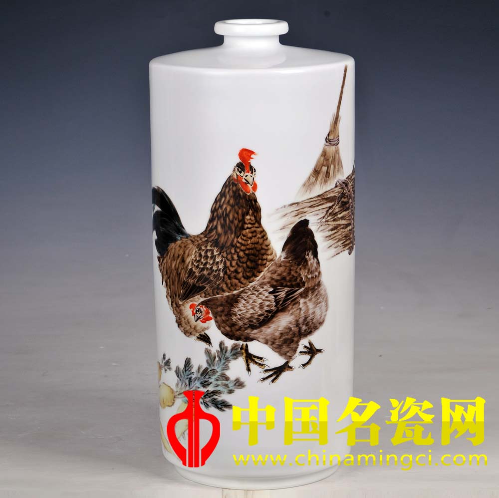 作品用笔简洁,技法娴熟,惟妙惟肖,传情达意。图中雄鸡炯炯有神,雌鸡悠闲的觅食,萝卜、扫把更是营造出了一副田园景色