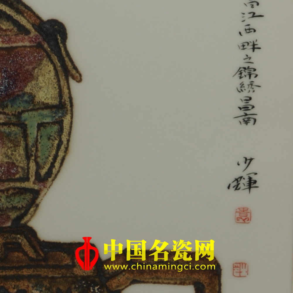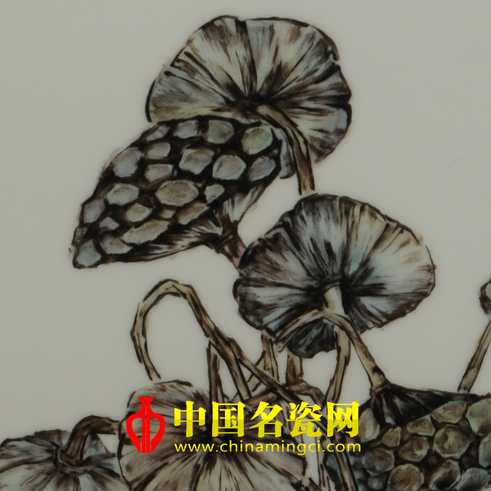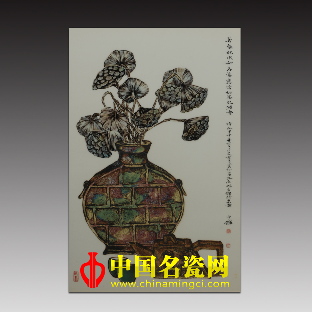 作品绘一古瓶,瓶中插几枝莲蓬,下面一把方壶,两杯香茗,茶香仿若飘然而出,清雅流露。在装饰手法上,袁少辉老师大胆创新标新立异,以高温釉变的形式来表现画面,高温下釉彩流动变化的肌理让作品别具一格,可谓独一无二。(李静)