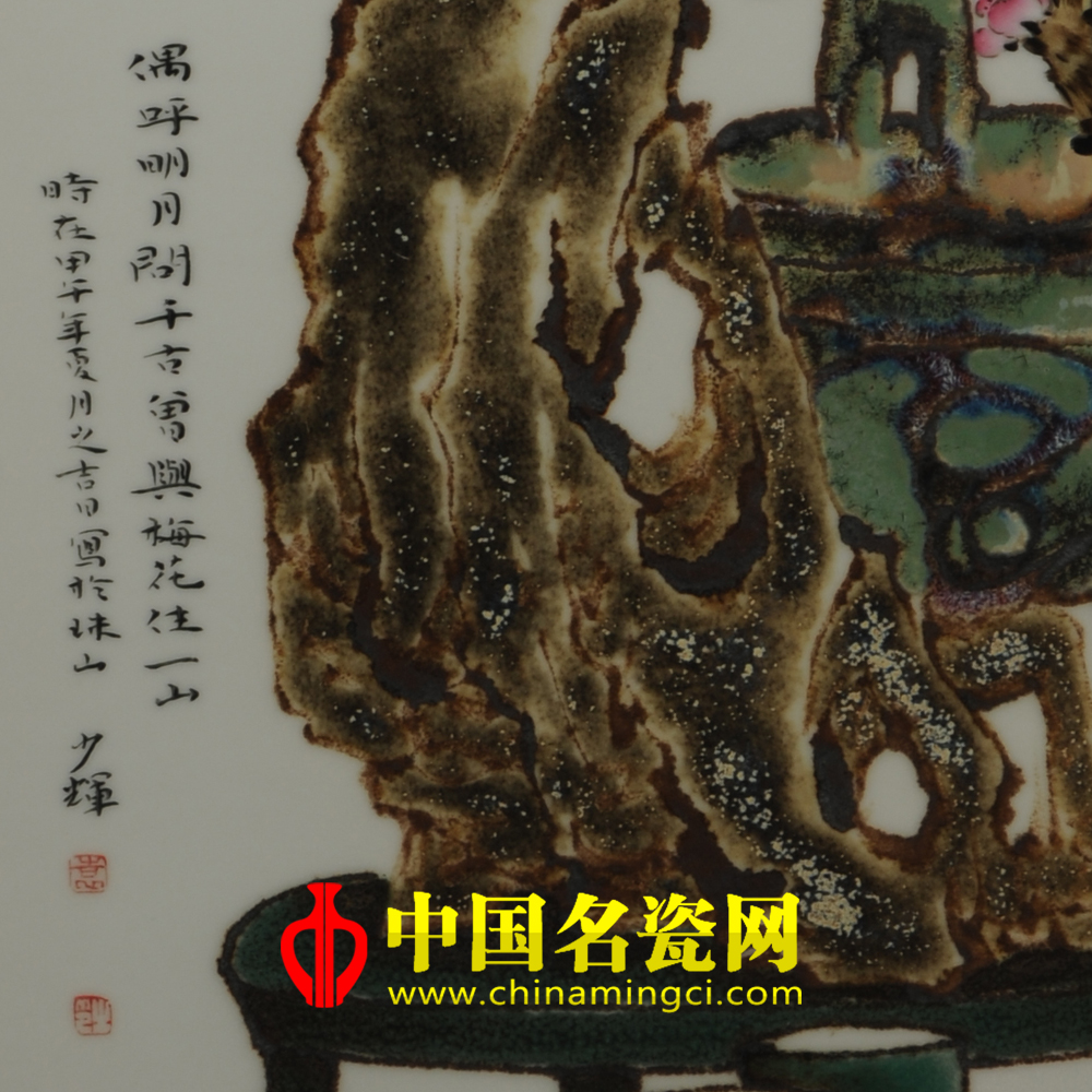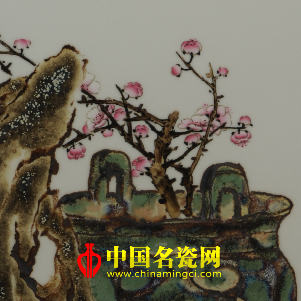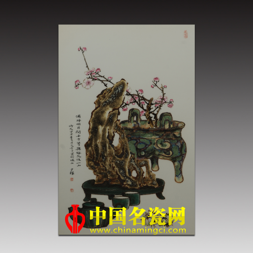 作品别开生面,用陶瓷特有的语言表达一种古风的韵味。布局上,吸取宋画博古图的精髓,宝鼎、奇石以高温釉变的手法表现色釉流变产生的肌理,更显其古拙。鼎中一枝怒放的红梅可谓点睛之笔与下面一套品茗佳器让作品古韵流淌其中又别有一番逸趣。