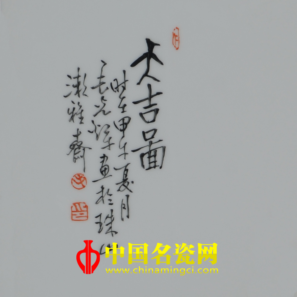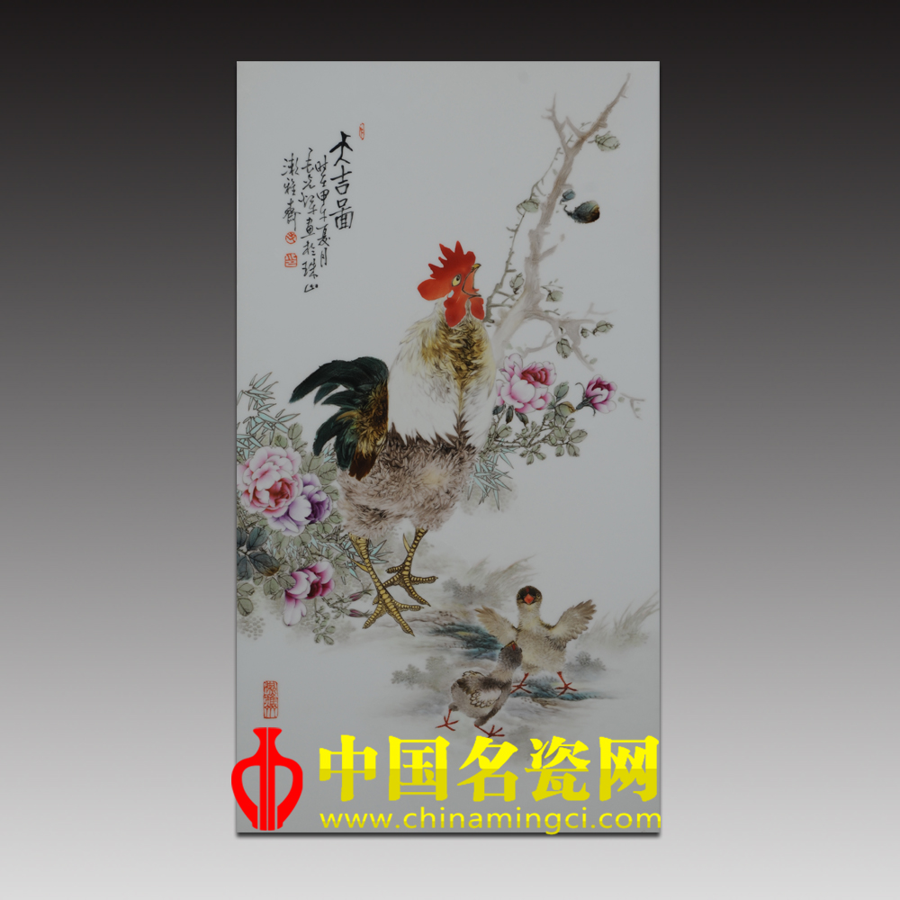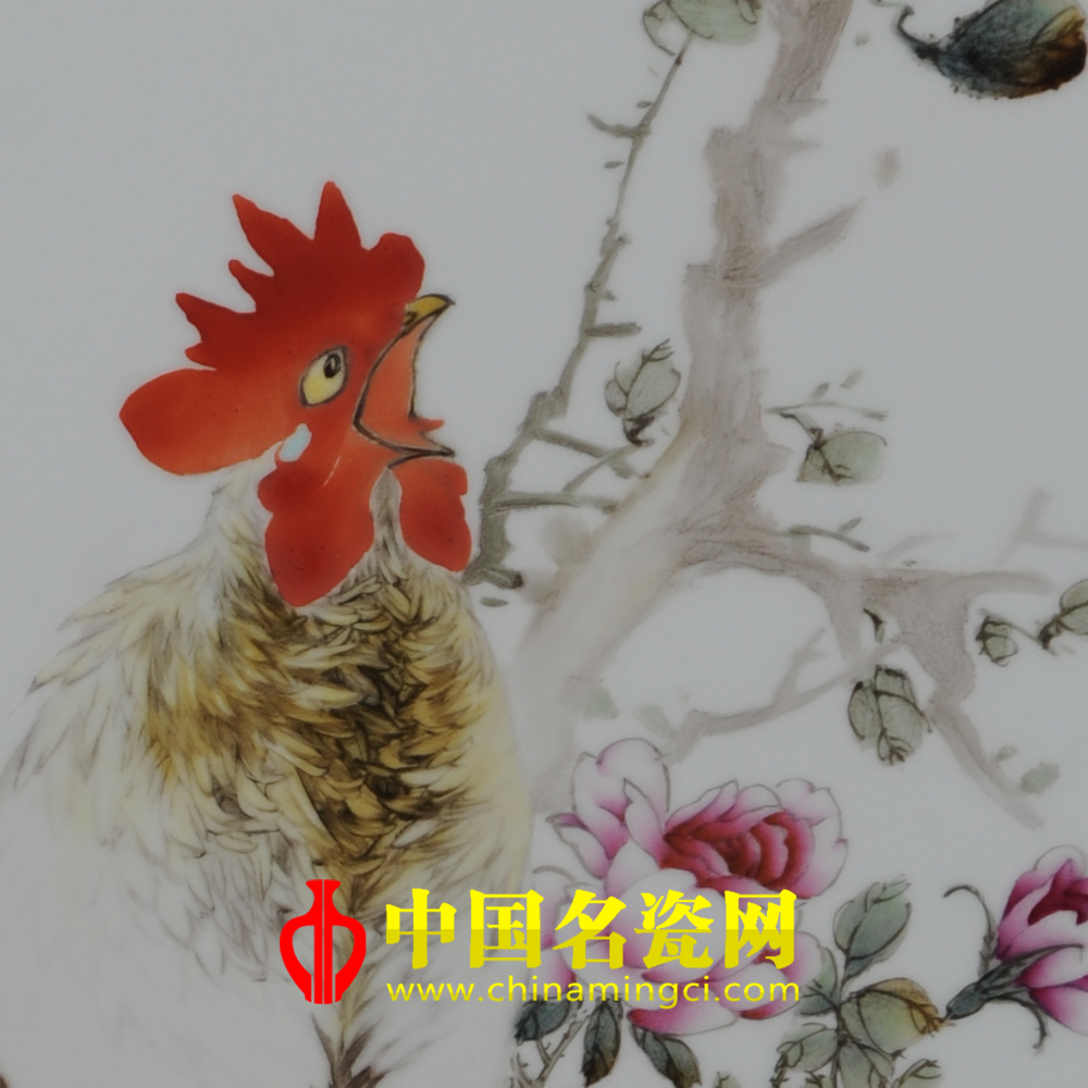 作品以板作画,花鸟相映,构图匀称。雄鸡体态丰满昂首高歌,身下两只雏鸡姿态舒展,活泼嬉戏,稚气洋溢。正所谓“不逐群芳更代谢,一生享用四时春”地面的月季更是与题款交相辉映,四季平安、大吉大利。