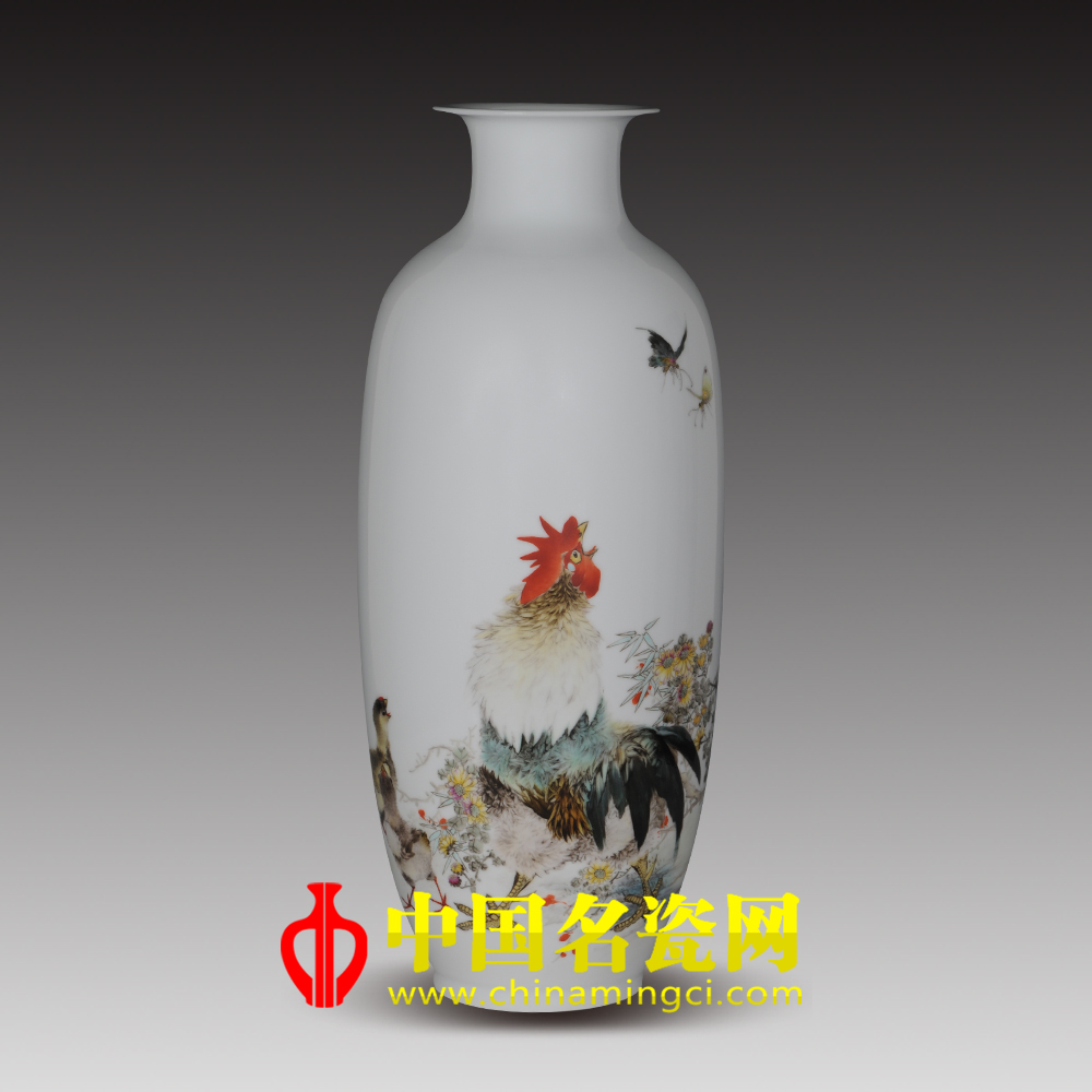 作品为150件粉彩瓷瓶。花鸟相衬,上疏下密,画面恬静适然,雄鸡与蝴蝶相呼应,形态丰满,充满动感,两只幼雏紧挨其身,形态夸张更是活泼动人。地面的黄菊更是散发迷人的清香,与整个动态的画面相对应,使整个画面动静结合,呈现了一幅淳朴的傍晚风景。(靖晨硕)
