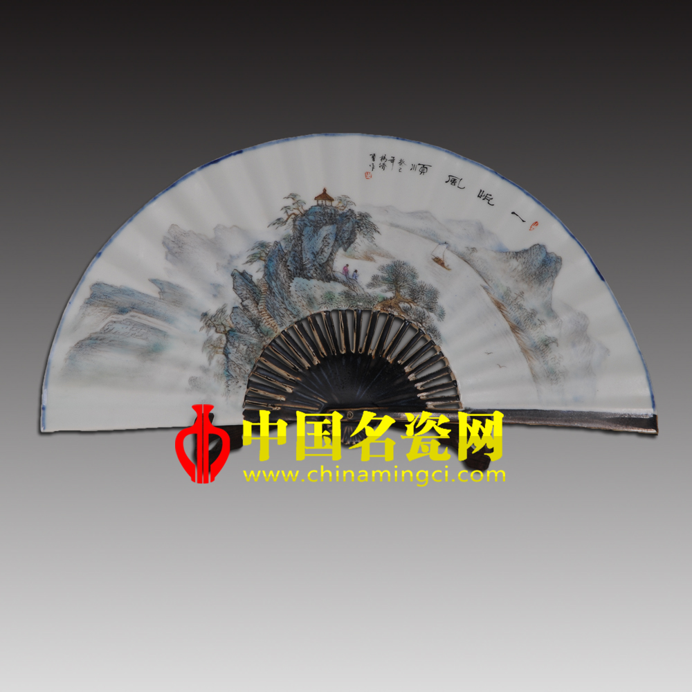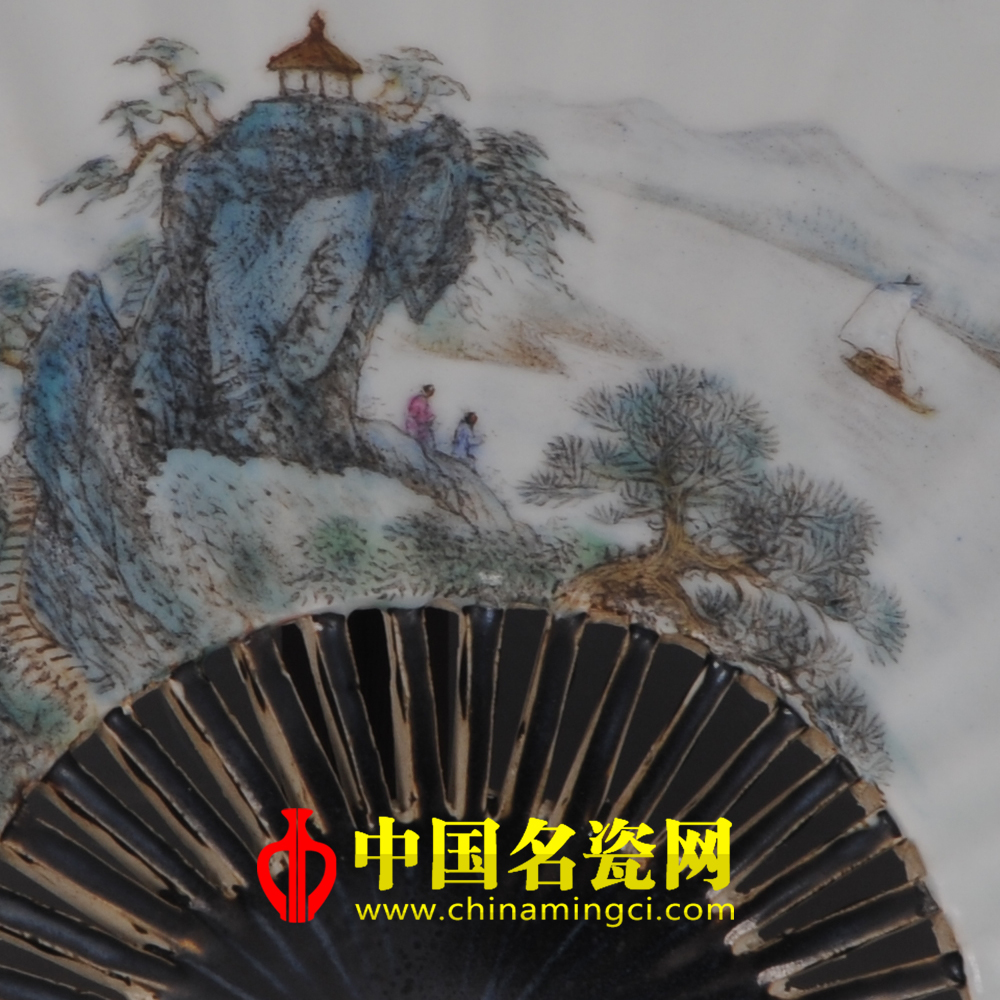 扇面作山水画,较为稀见。作品中,远山影绰,逶迤连绵,隐现于缭绕的云雾之中。近处层峦青翠,人闲舟静,掩映于繁茂的树林之间。远景与近景通过江水有机衔接,体现了一虚一实的画面关系。使整幅画充满动感和张力。茂树层峦间的亭台、江畔边的人烟,成为整幅画的点睛处理,增添了生活气息。整幅作品体现了作者“胸有丘壑,情有寄托,心有诗意”。