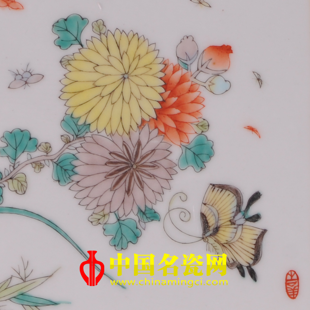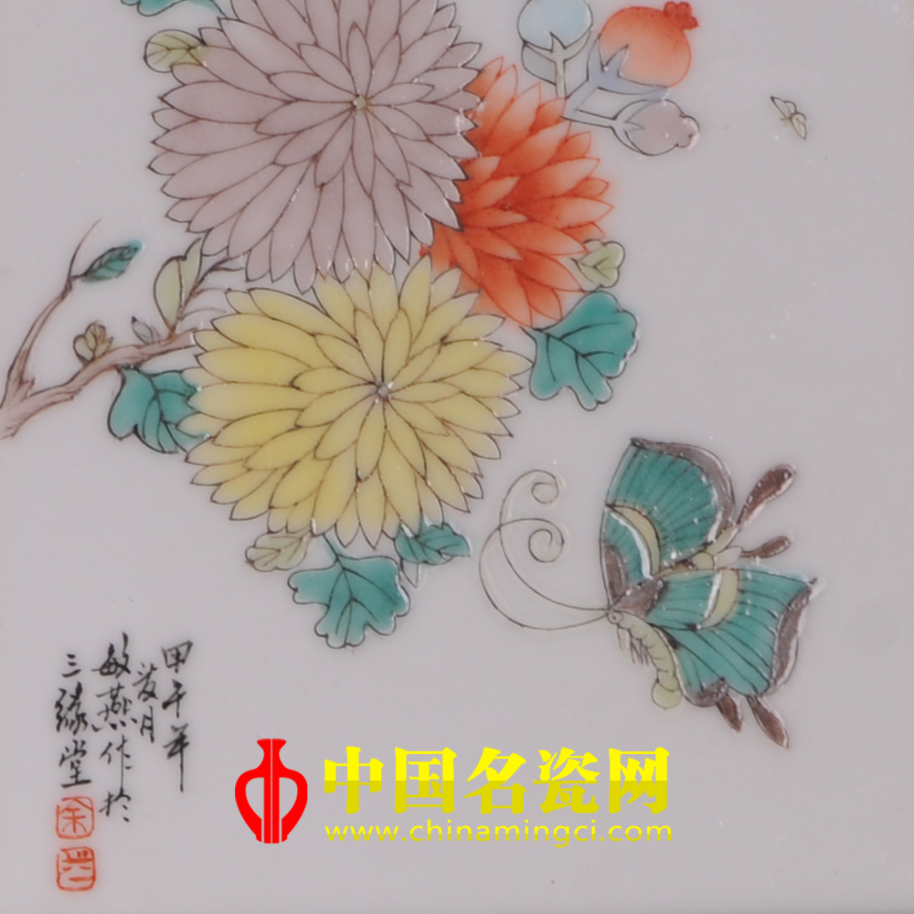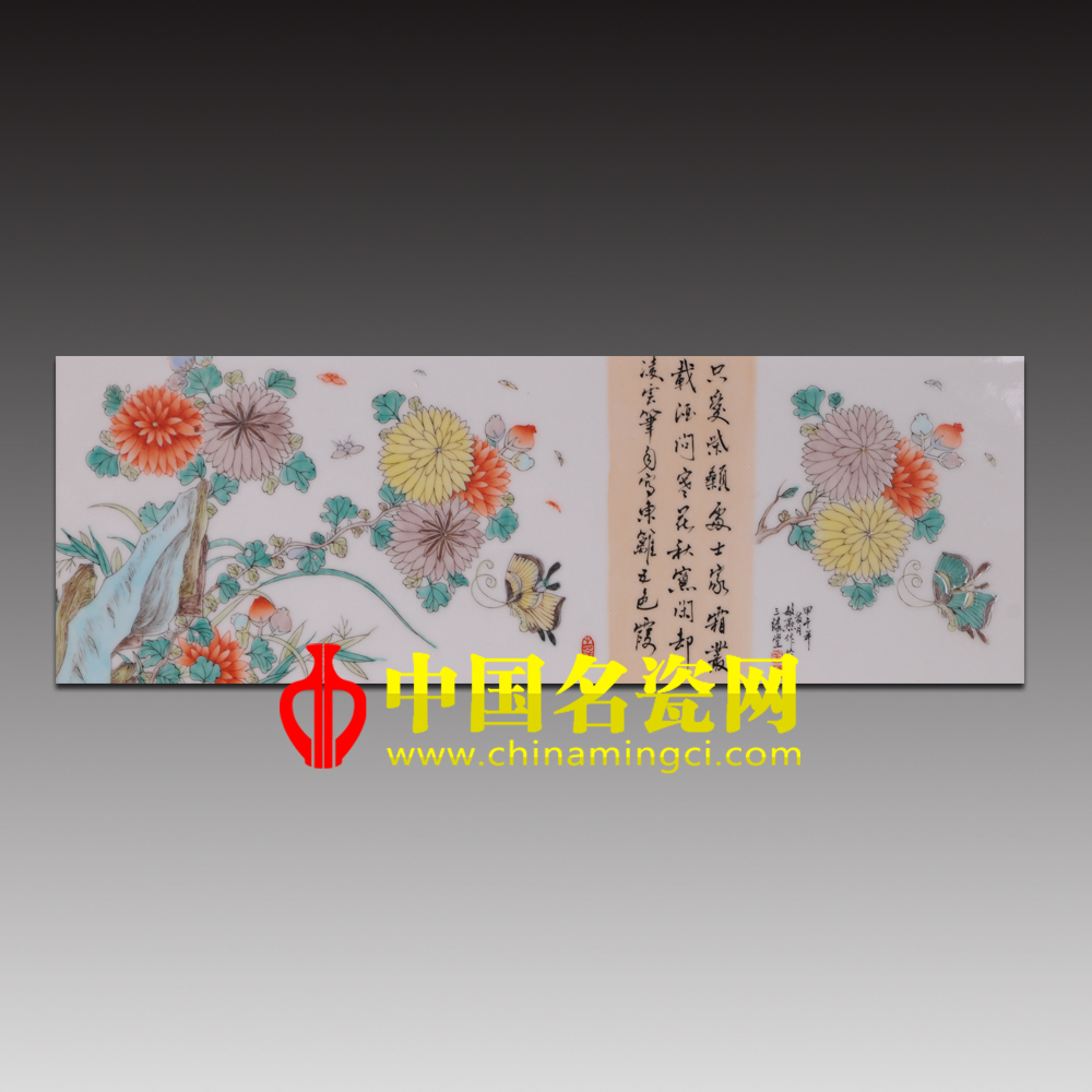 作品以长瓷板作画,中间为诗两旁作画,构图新颖,别具一格。作品虽画的是秋菊,却并未令人感到秋冷霜威的凄凉,恰是秋菊华茂,阵阵的花香引来两只蝴蝶翩翩起舞,最是应了那句“欲知却老延龄药,百草催时始起花”,整件作品线条细秀,色感明艳,具有一定的艺术感染力。(宿亚兰)
