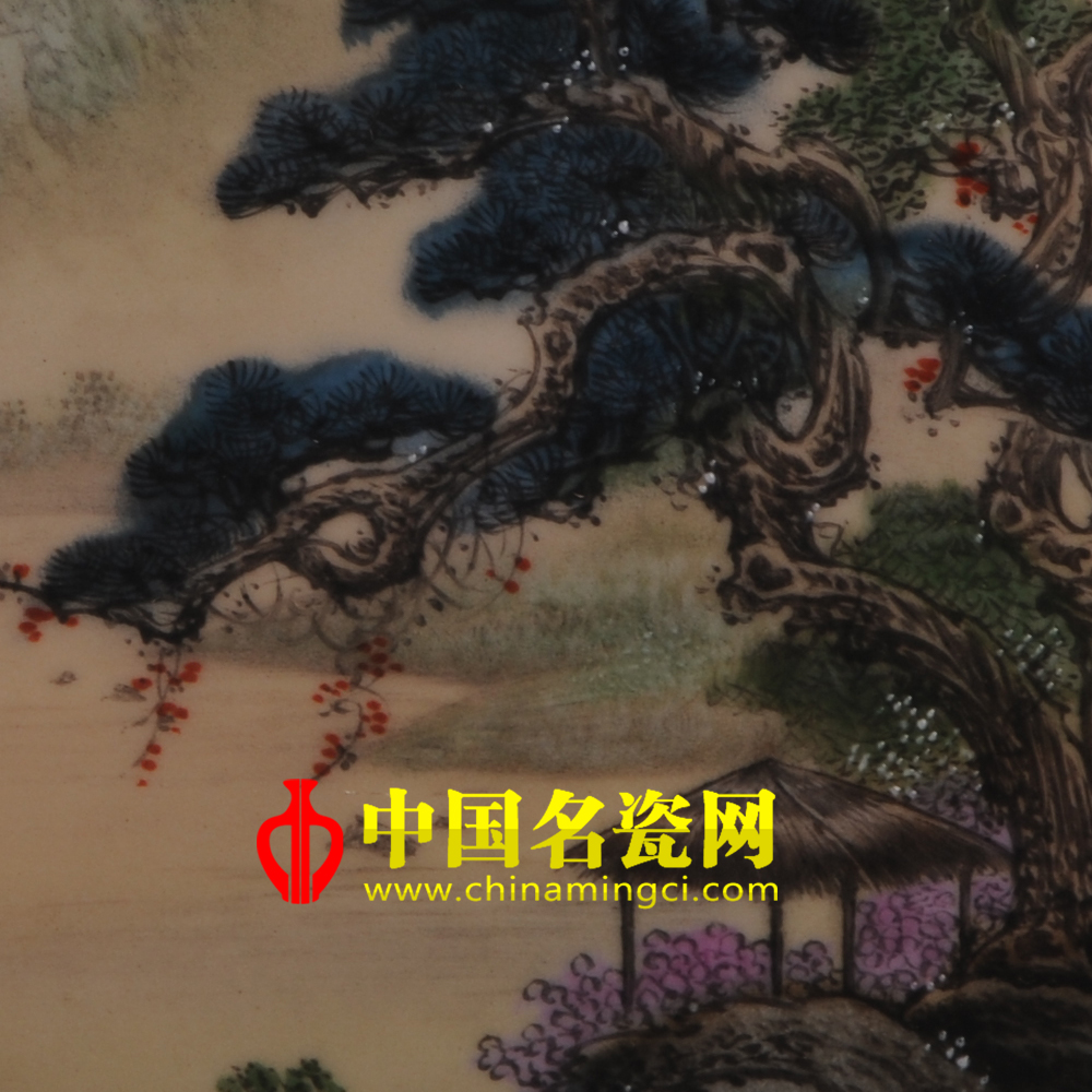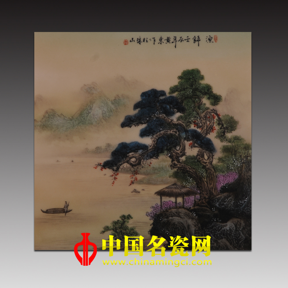 此作品方板作画,以近及远,近处的松树雄伟挺拔,松下绘有岩石、草亭,中景花香四溢,草木繁密,远景山峦迎面,水雾弥漫,整个画面布局右实左虚,而右侧绘以静景,左侧则绘以源源不断的流水,渔夫泛舟归来,使整个画面动静结合,布局十分巧妙,整个画面色调自然清新,温润明净。可谓是:意趣美妙,景象天成,不是仙境,羡煞众生。(靖晨硕)
