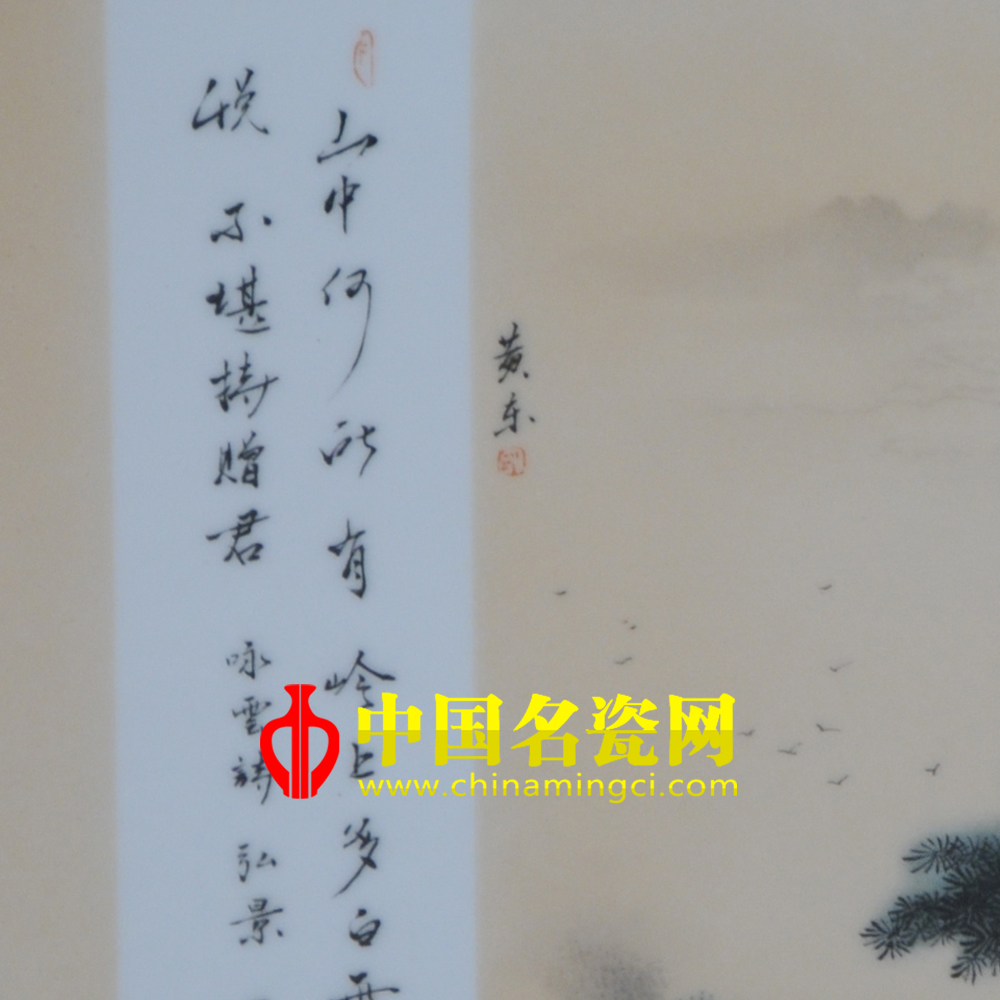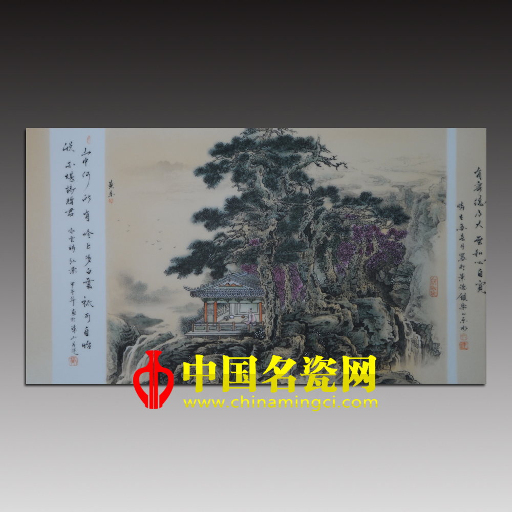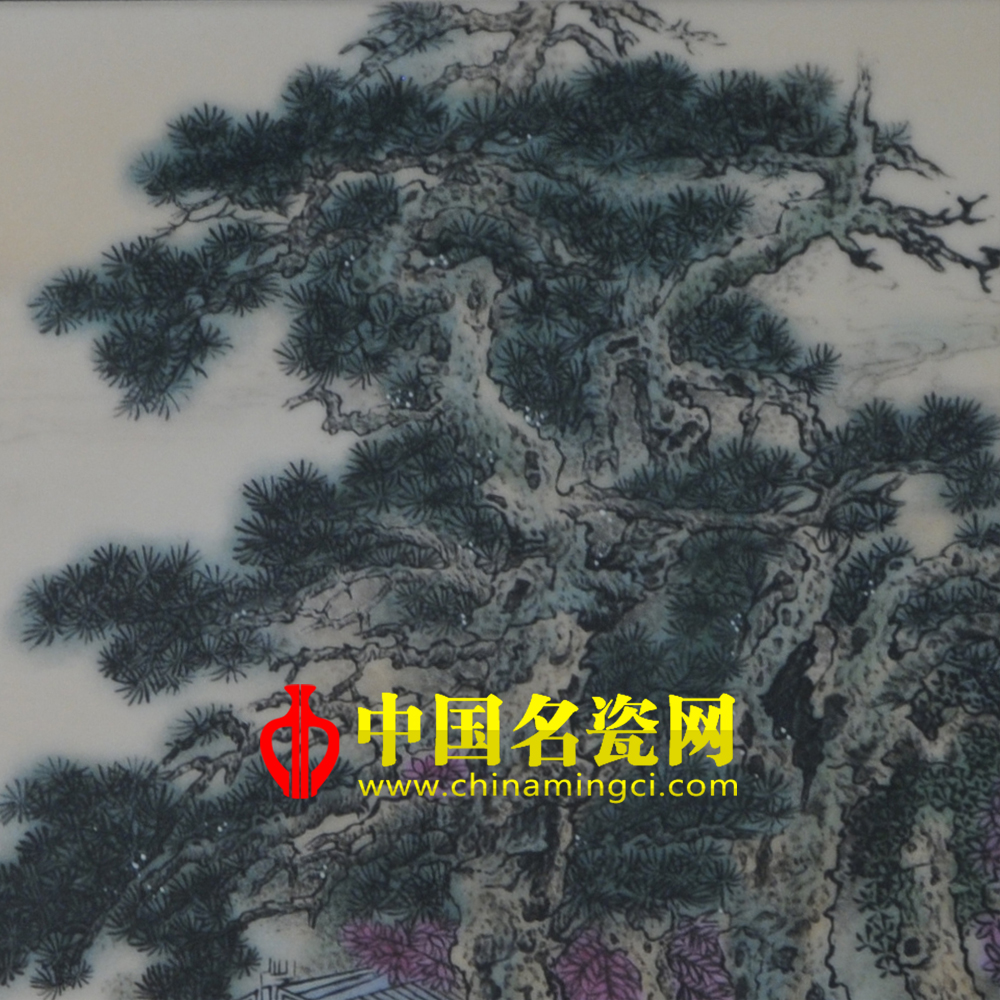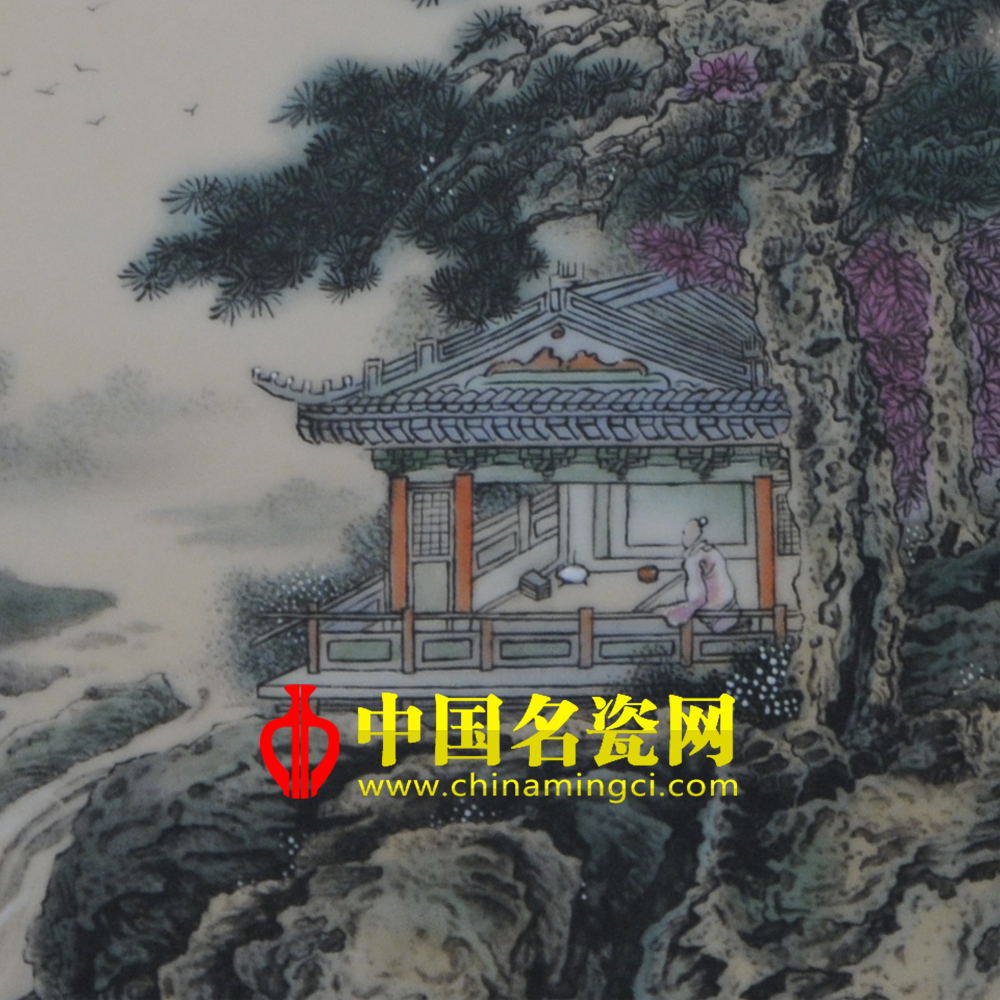 此作品《山中何所有》为1.8尺粉彩瓷板,构图极严密而用笔极松秀,用料则苍润兼济,一种淋漓率性圆转自如的洒脱情致,正是他自信而又技法纯熟的自然流露。一道瀑布,飞流直下,声如奔雷,澎湃咆哮,激揣翻腾,水气蒙蒙,珠玑四溅.每个水柱,每幅水帘,激冲下来,撞到山根的石头,碰得零碎,像千千万万的珠子。只见瀑布像银河下泻,在山脚激起千波万浪。这飞流好似千万匹猛兽在搏斗,在怒吼,最后互相扭打着翻滚下来,溅得满山谷珠飞玉散,一片雾气燕翻腾.抬头看来,弥漫长空的灰白浮云,遮断了青天,好像一座帐篷,把整个荒原当作了它的地席,云千姿百态形状,让人怜爱,让人爱惜,同时鼓励了人们,不要对人生的迷茫,浓云过后就是晴天,拨云见日也不足为提,只要勇敢地走下去,都会成功!再看那整个画面的背景颜色,瀑布、云朵、自由翱翔在天际的大雁及别具一格的亭子相结合,呈现出一副美轮美奂景象。