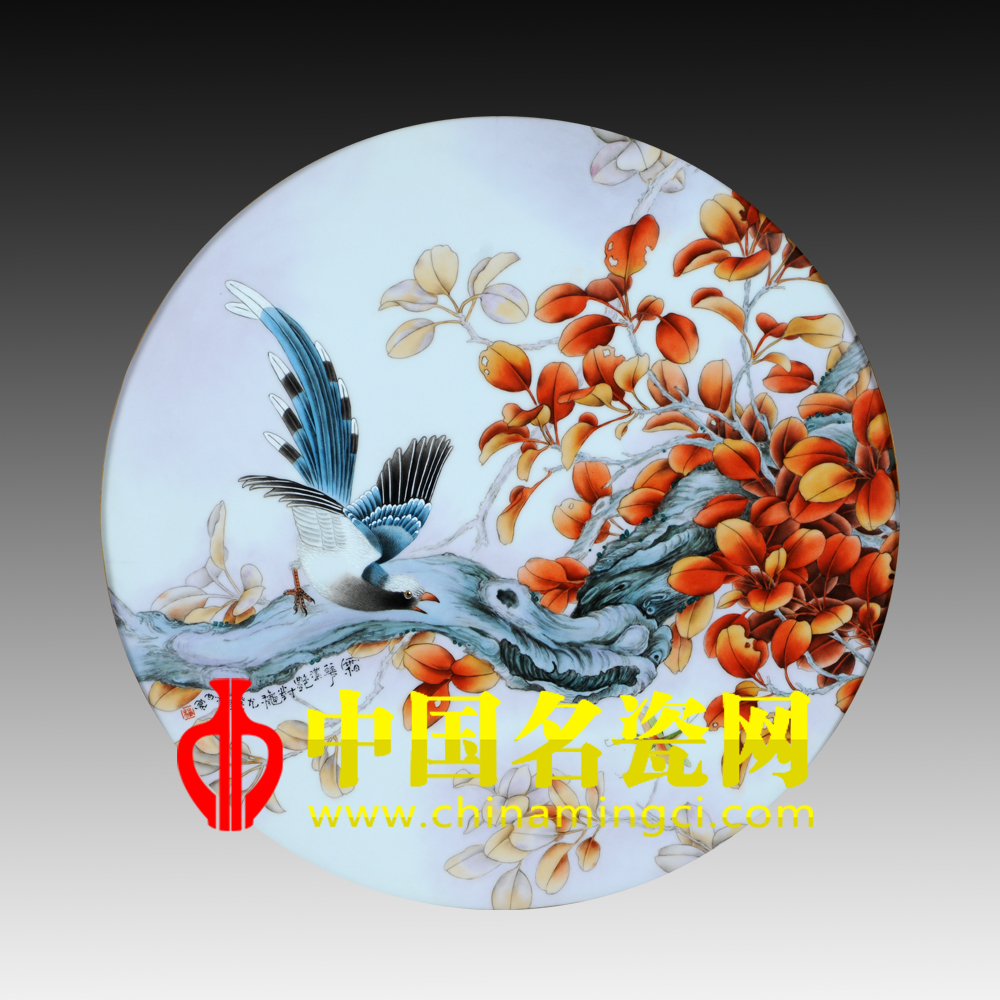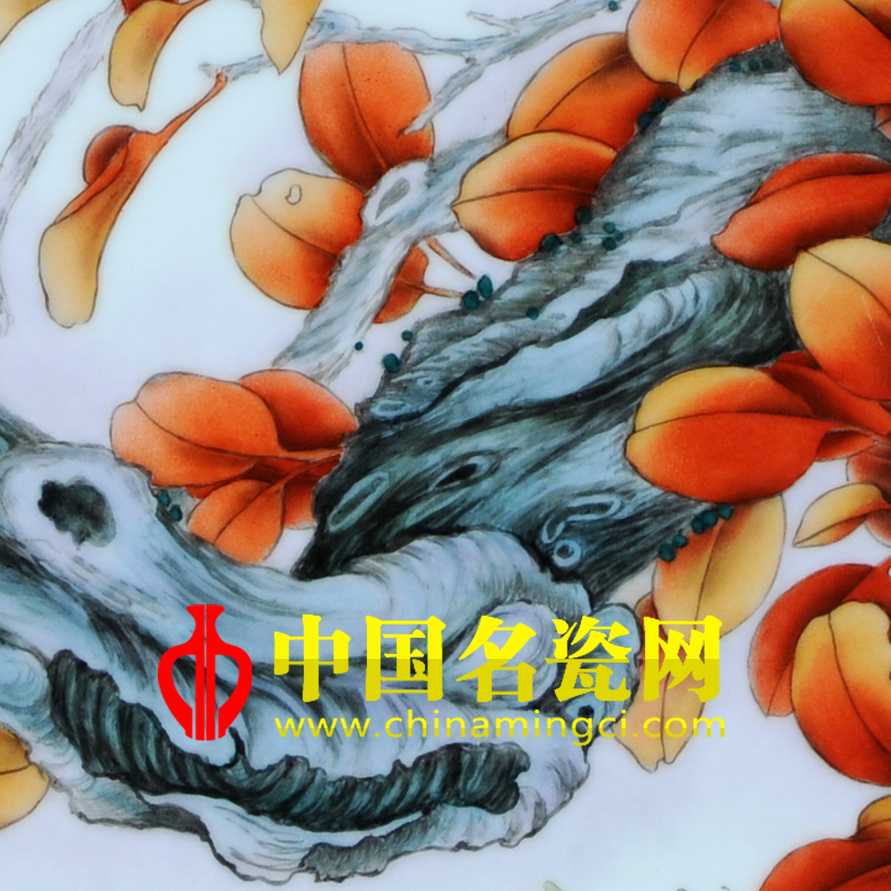 画面中绘秋色中一株布满红叶的树,枝繁叶茂,红叶浓密。层次分明,老树枝干斑驳,凸显其苍劲、生机和活力。画面设色浓艳,笔意流畅。祥瑞之鸟栖息于枝干之上,展翅欲飞,鸣叫声声,画面气韵生动,艺术性与观赏性于一体,作品浓淡兼施,趣味性强,充满浓浓的生活气息。