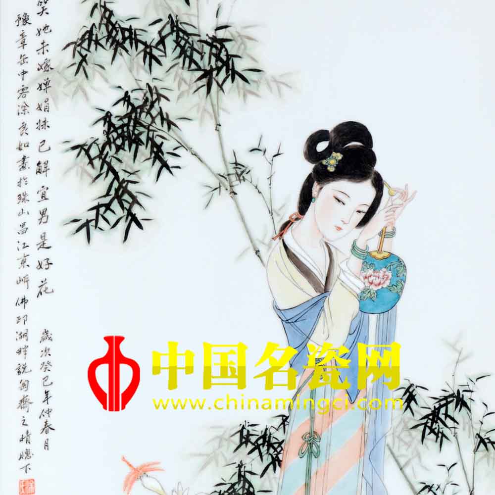 作品中婆娑竹影下,一古典女子,身姿婀娜修长,发髻高绾,峨眉淡扫,略施粉黛,身穿纱质长裙,轻移莲步,流苏轻摇,双手轻拢发丝,眉眼含羞,看着旁边的宜男花,宜男花是人丁兴旺的象征,反映了女子对未来美好生活的向往。构图简练,色彩淡雅,给人以丰富的想象空间。