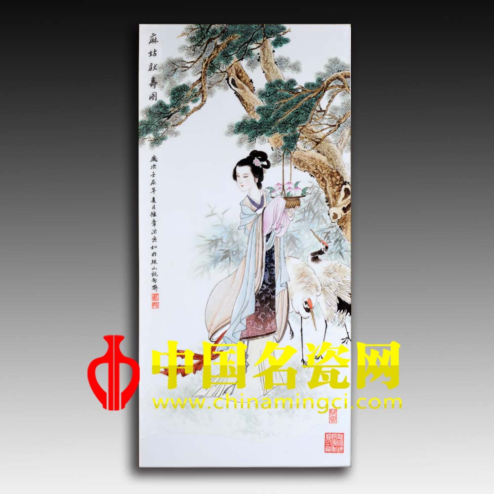 瓷板左侧书“麻姑献寿图”,岁次壬辰年夏月豫章涂良如作于珠山说陶斋,铃红色印章“涂氏”。