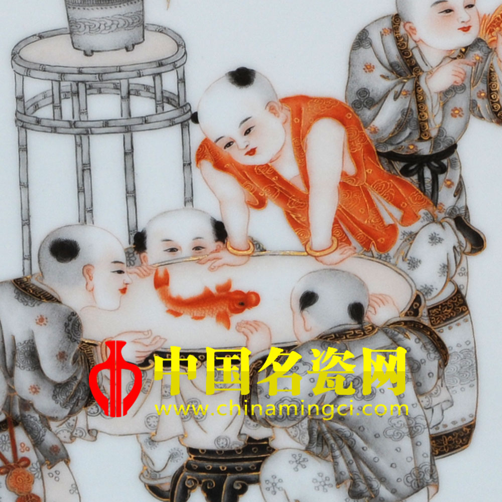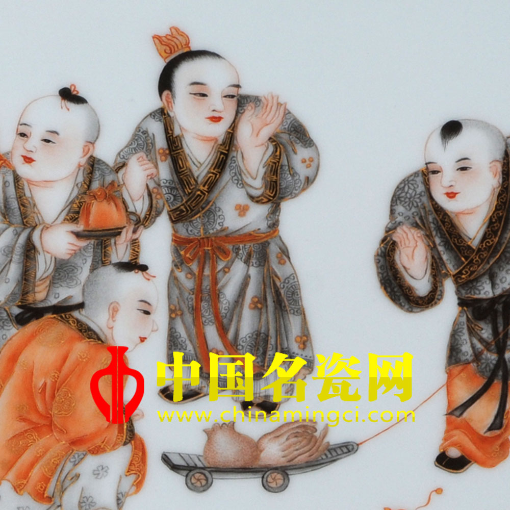 此画面构图疏落有致,孩童众多,十六童子三五一组,姿态生动,栩栩如生,呈现出热闹欢快的气氛,孩童衣着线条流畅,头面饱满朗润,特别是神情、动作,刻画细腻传神,稚气惹人爱怜,此作品以孩童为主题,寓意盛世太平,人丁兴旺,同时表达作者内心世界纯挚的情怀。