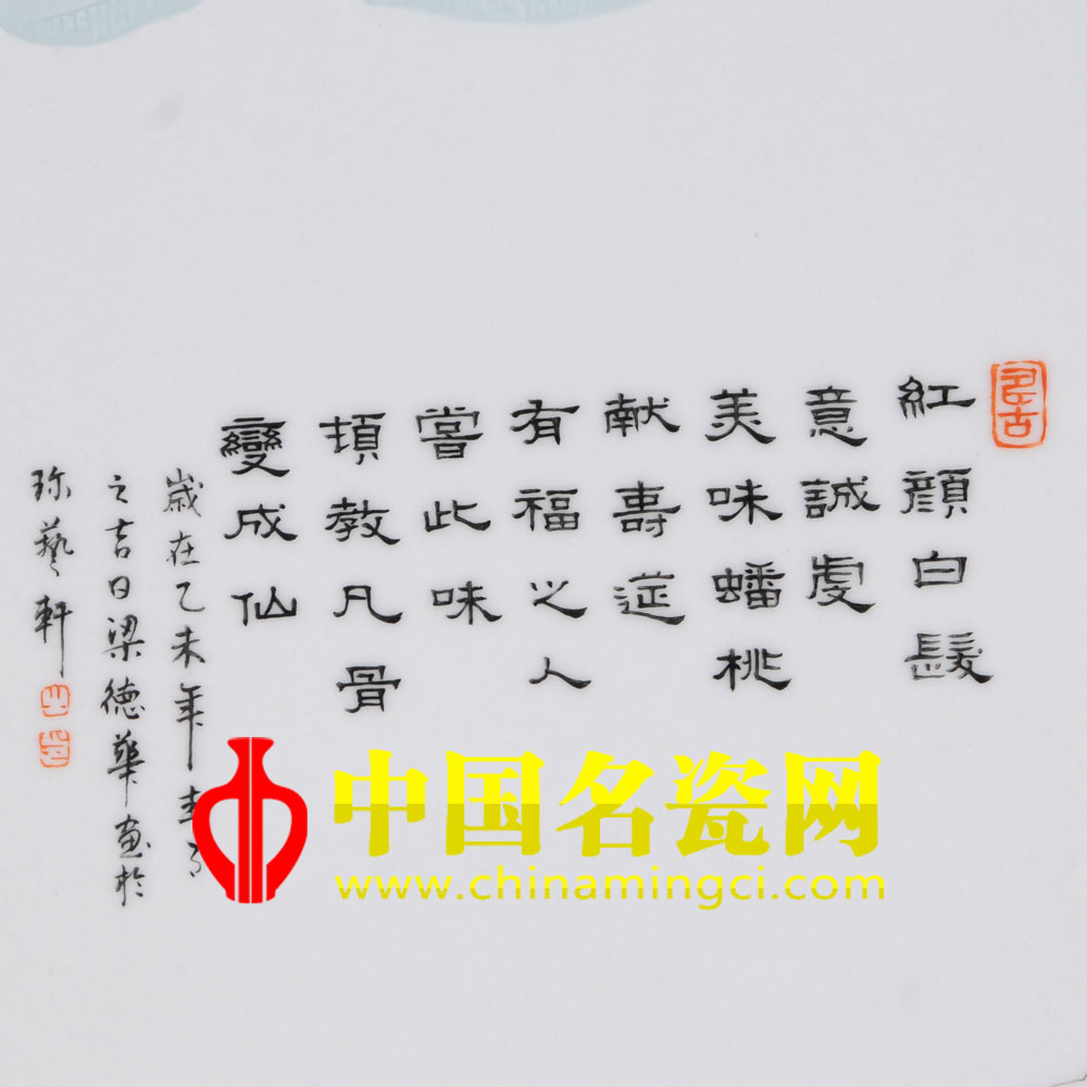 “红颜白发意诚虔,美味蟠桃献寿延,有福之人尝此味,顿教凡骨变成仙。”此作品题材取自麻姑赴瑶池为王母献寿的传说。
