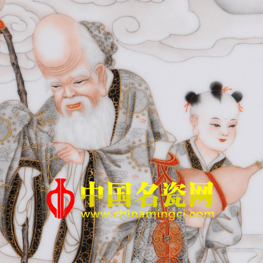 麻姑罗裙精美,眉清目秀,娴雅慈祥,手持盛有美酒的宝爵,身右侧瑞兽梅花鹿跟随女主人亦步亦趋,身左侧跟随一手捧寿桃的仙童。镶器另一侧描绘随同麻姑去赴宴的老寿星,寿星长眉长鬓,福耳硕鼻,额头凸起,手持寿杖一身福气,身后也紧紧跟随着手抱宝葫芦的童子,童子目光向远方张望,似是为赴宴而感到兴奋不已,