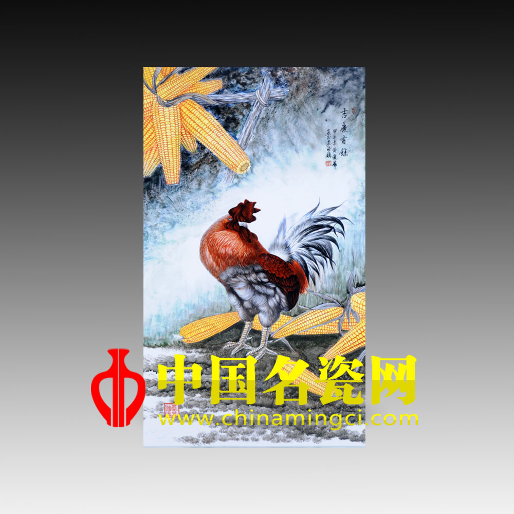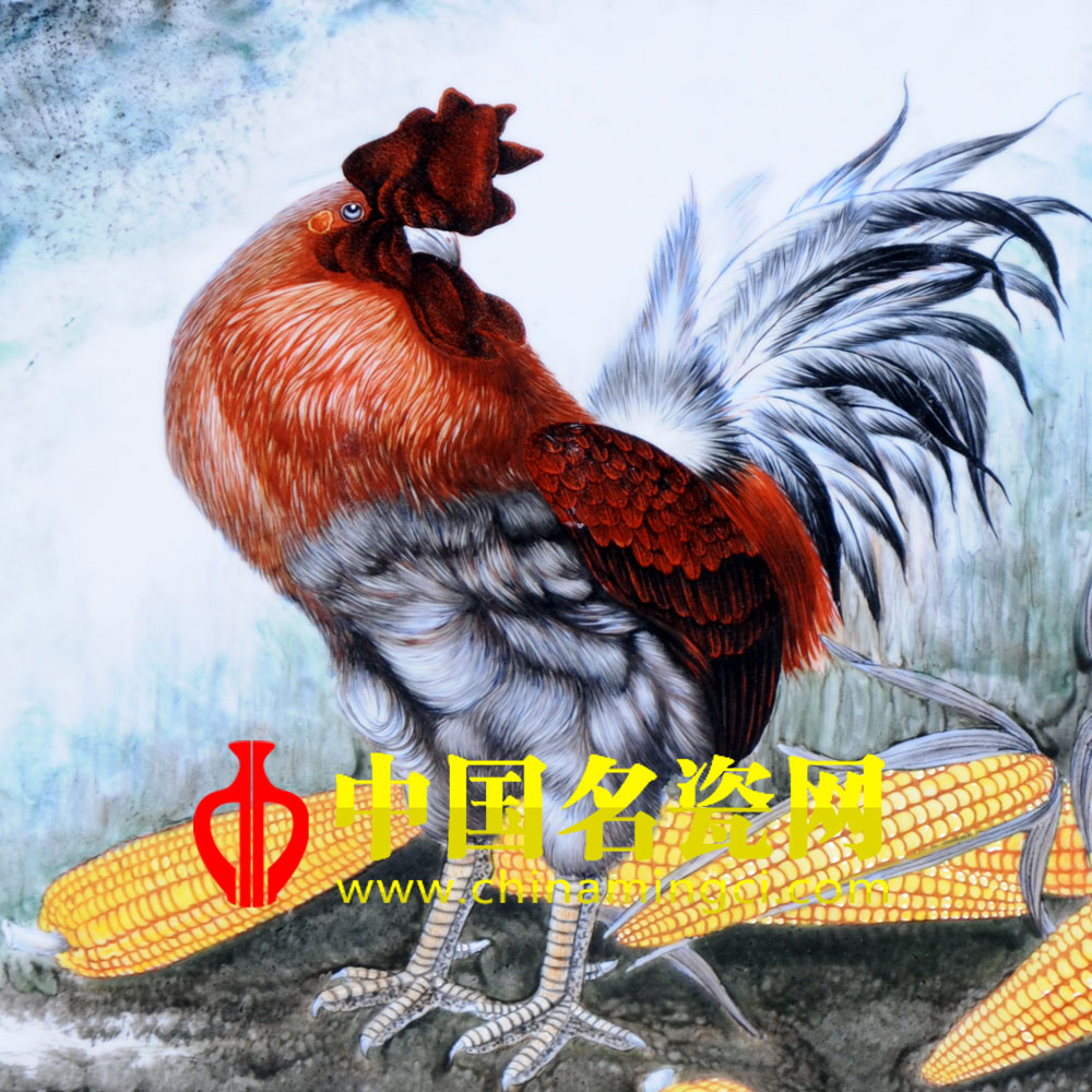 鸡是人们喜爱和文人表现的对象,他表达人们向往红火生活的美好愿望,此图在淡墨渲染的背景下,一只公鸡立于石头之上,华冠彩羽,冠红似火,喙之尖锐,爪之强壮,威风凛凛,姿态矫健,左上方几只硕大的玉米伸入画面,颗粒饱满,在朦胧背景下更显金黄醒目,借喻“盛世丰年,吉庆有余”美好愿望。