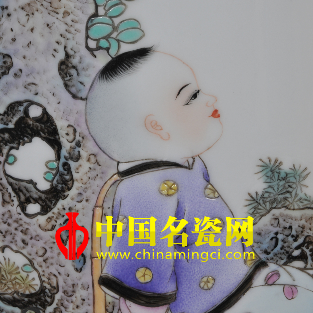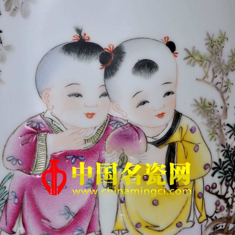 作品中一株桂花树下,宽阔的庭院里,两孩童头面饱满俊俏,眉眼含笑,表情自然纯真,充满稚嫩,手捧硕大桃子,颜色鲜艳,垂涎欲滴,周围美好的景色,花红柳绿,天高云淡,映衬了孩子天真无邪的童年世界。作者构思巧妙,色彩鲜艳,主题与配景相辅相成。