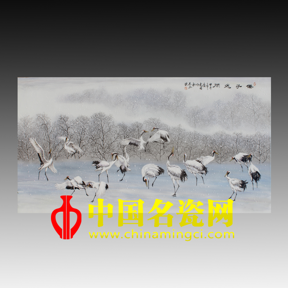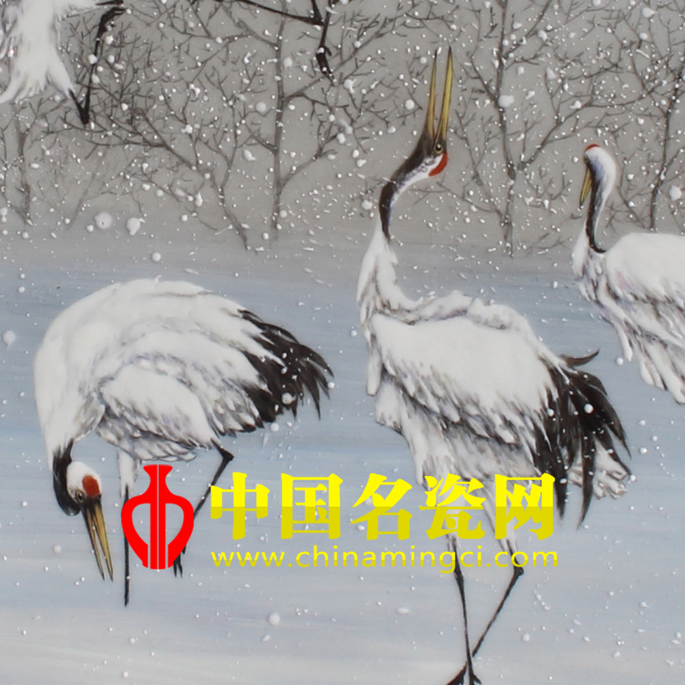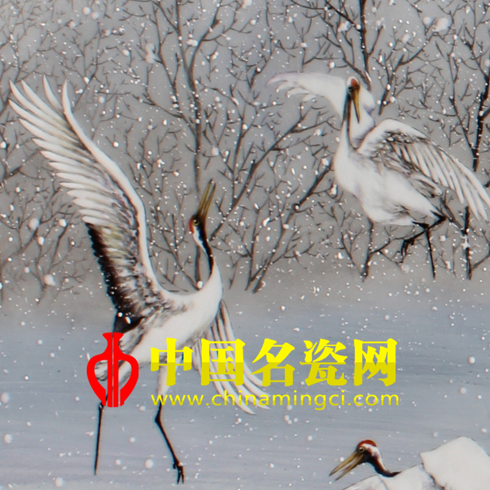 此画中的仙鹤着实吸人眼球,在皑皑白雪中自由的飞舞,形态各异,神态栩栩如生,几欲脱纸而出。远处繁密的树林,都被盖上了一层厚厚的积雪,大地万物都被染成了银色。此时此刻鹅毛大雪还在纷纷而落,配以飞舞的仙鹤,给寂静的万物增添了一丝生机,让人感到了一种闲适生活里逍遥自在的感觉。(靖晨硕)