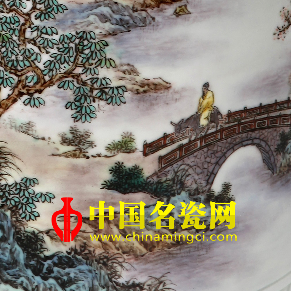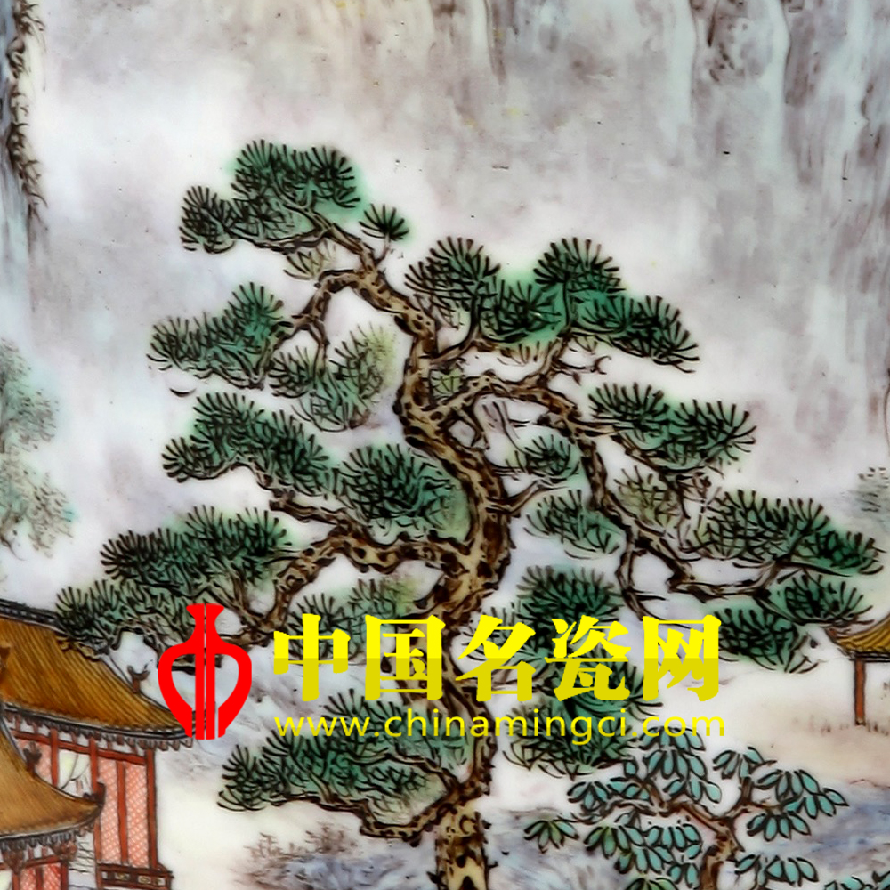 画中远山缥缈,朦胧奇逸秀丽,近山凝重,峭拔陡峻。松树挺拔多姿,石乱木秀,溪涧清澈,野径迂回曲折。中景众多的房屋亭台以及小桥流水行人,给秀丽的山水中增添了一丝烟火气息。此图笔墨工整细秀,自如流畅,层次丰富,充分显示其山水画缜密清润的艺术特色和个性风格。(靖晨硕)