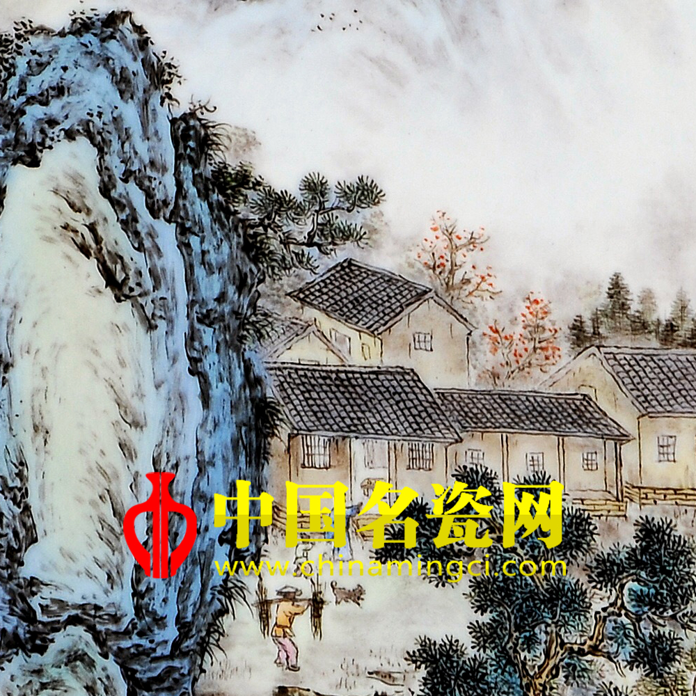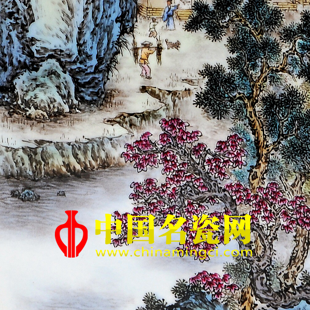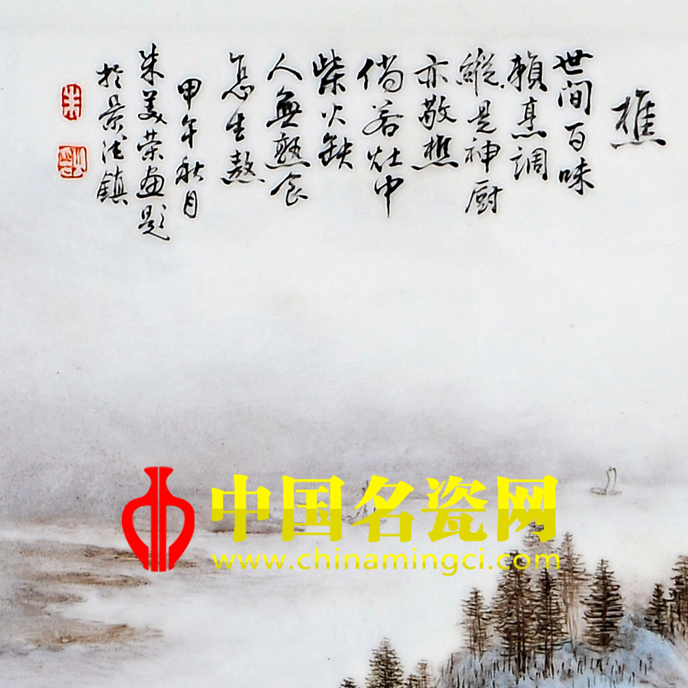 画作取材于农耕社会四个比较重要的职业,即“渔樵耕读”。四种职业在镶器四面单独成画,但又浑然一体。“渔”是东汉严子陵,他一生不仕,隐于浙江桐庐,垂钓终老;“樵”是汉武帝时大臣朱买臣,出身贫寒,靠卖柴为生,但酷爱读书;“耕”所指是舜在历山下教民众耕种的场景;“读”则是讲述苏秦埋头苦读的情景。作者用山水画表达这四个故事,也反映了现代人对这种田园生活的恣意和淡泊自如的人生境界的向往。(靖晨硕)