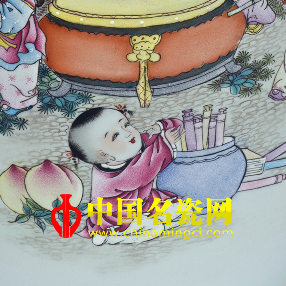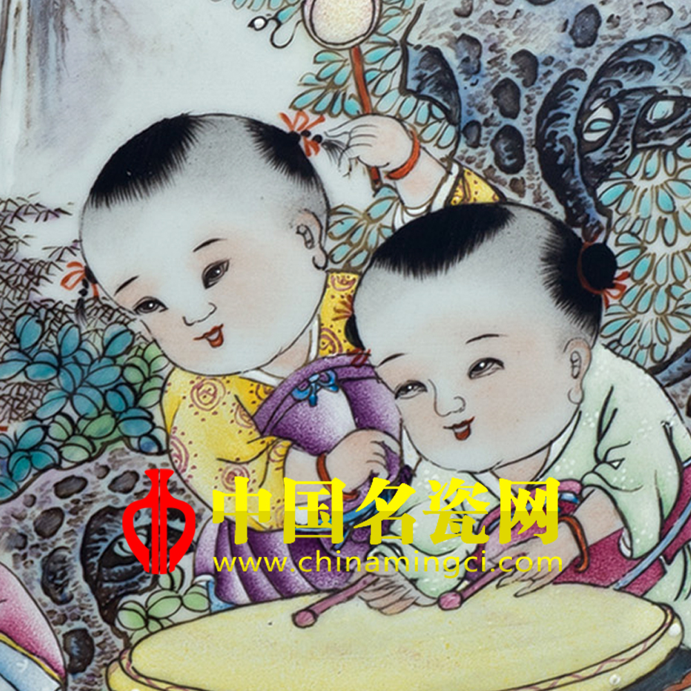 作品描绘三五孩童在庭院里玩耍的场景。他们个个眉眼含笑,皮肤白嫩,头面俊朗饱满,身穿花衣彩裤,挥动手臂,敲鼓吹笛,无拘无束玩耍,后有假山,瀑布相伴,具有浓浓的生活气息。让观者被他们的快乐无比的童年生活感染,引起我们对童年的怀念。作品工笔重彩,敷色典雅,匠心独到。(刘建格)