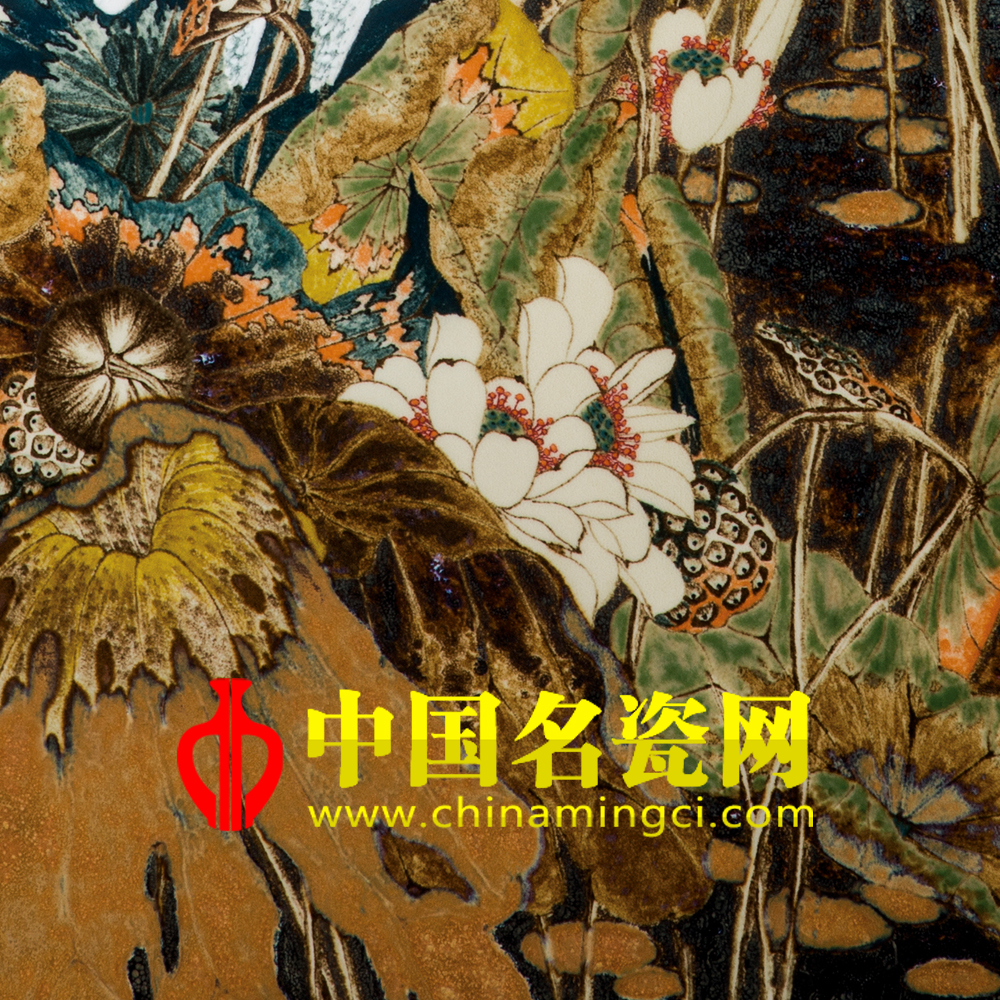 画中作者通过沉稳的笔墨,精巧的构图,以色彩为主,以高温油做装饰,吸人眼球。画面中一片荷叶散立在河塘边,它们黄绿色的叶子以及散落的姿态,告诉我们它们已经离开池塘很久了。几只仙鹤在池塘边嬉戏,姿态各异,给画面增添了一些生机,使整幅画面和谐美好。画中荷花、莲子、仙鹤等均是吉祥之物。整个构图寓意美好,又给人完美的视觉享受。(靖晨硕)