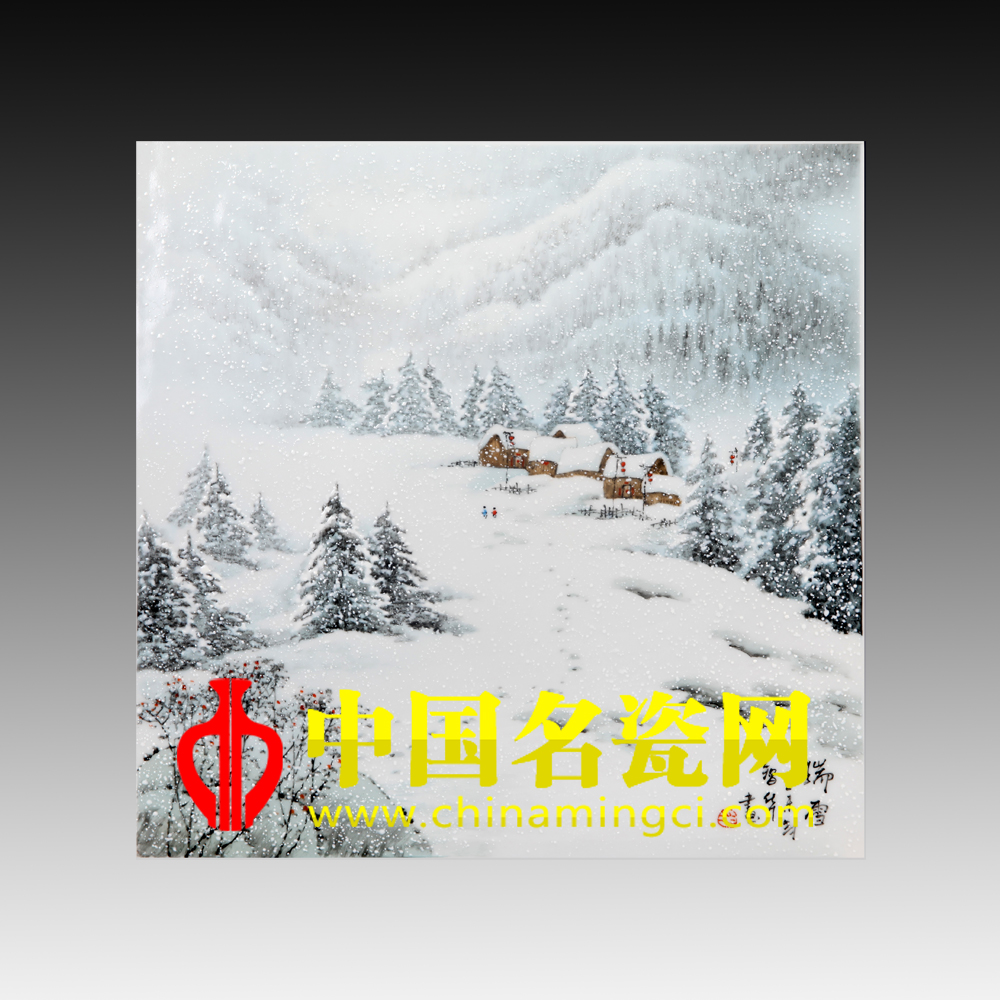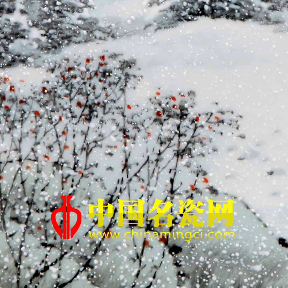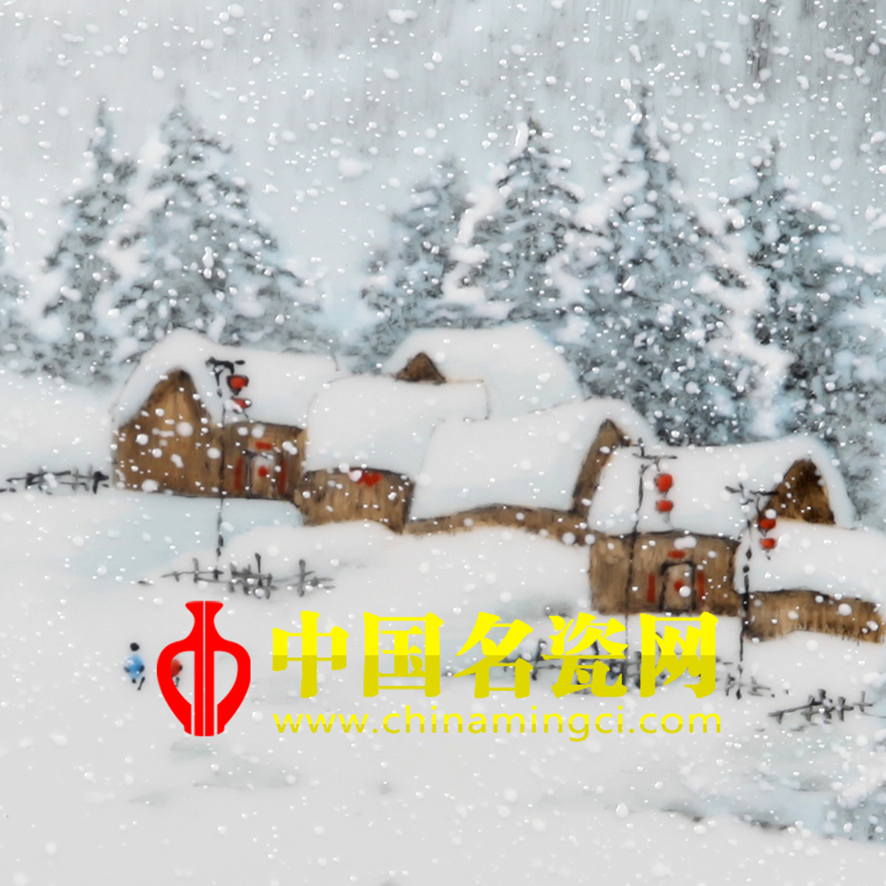 作品构图严谨自然,染色冷中有暖,表意静蕴生机。整幅作品笔墨秀润,韵现冬质,精彩呈现了寒冬之美。画面上万物都被染成了银色,显得格外洁白耀眼,远远望去雪峰连绵,银木凌空,居有人家,空中鹅毛般的大雪纷纷落下,人们行走在路上仿佛听见沙沙的声音,给寂静的冬天添加了一丝动感,房屋前的红灯笼以及怒放的红梅更是犹如给银白的雪上添上了点睛的一笔,让这瑞雪有了吉祥之意,呈现了一幅“瑞雪兆丰年”的情景。