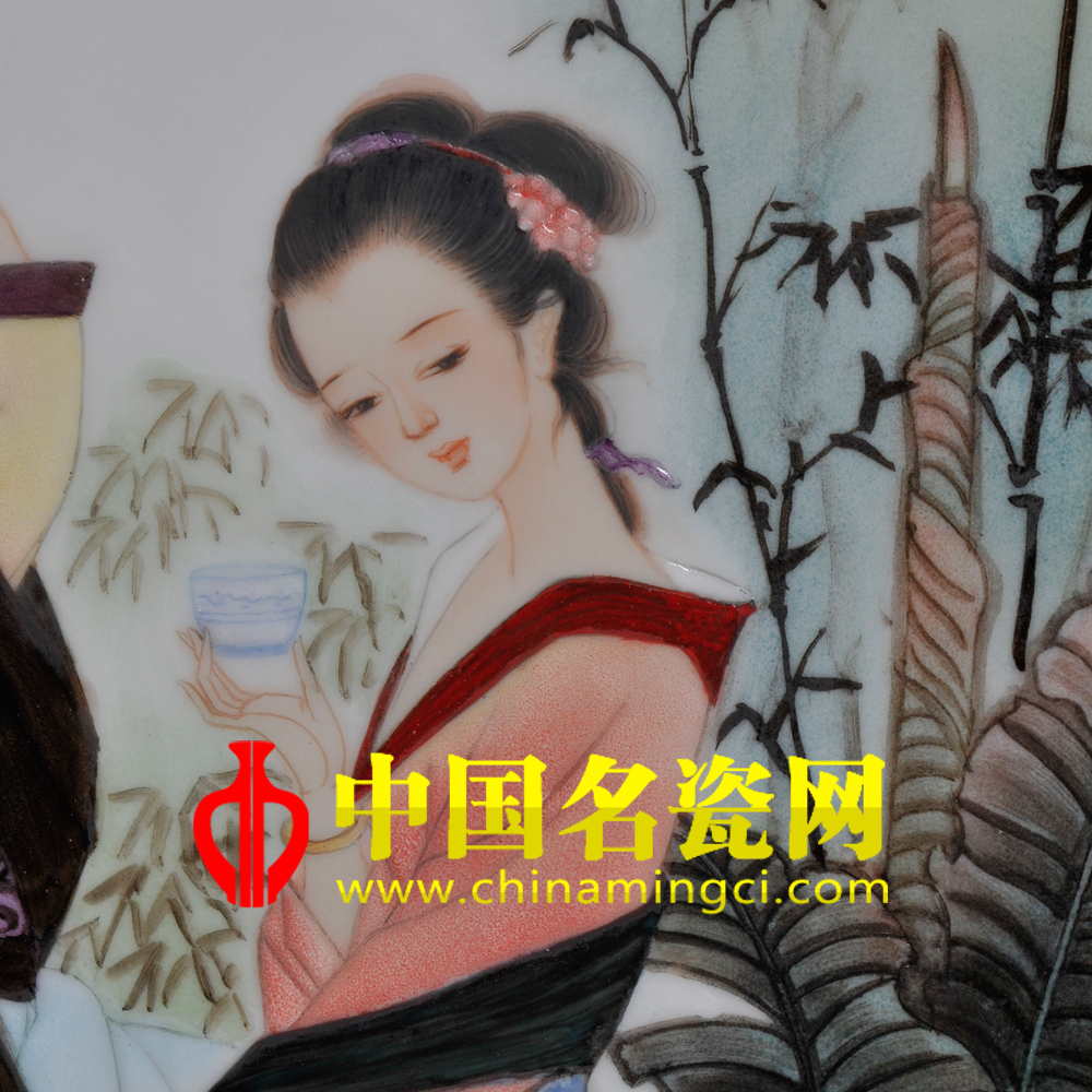 “人生得意须尽欢,莫使金樽空对月”,画面中秀树、奇石与美女浑然一体,仕女坐于树前石间,形态情貌各异,玉肤配以素雅纱裙,高绾发髻配以鹅蛋型脸庞,工笔刻画入微,无一不精到处理,处处可鉴匠心独运,点点可见恰到好处之协调美。