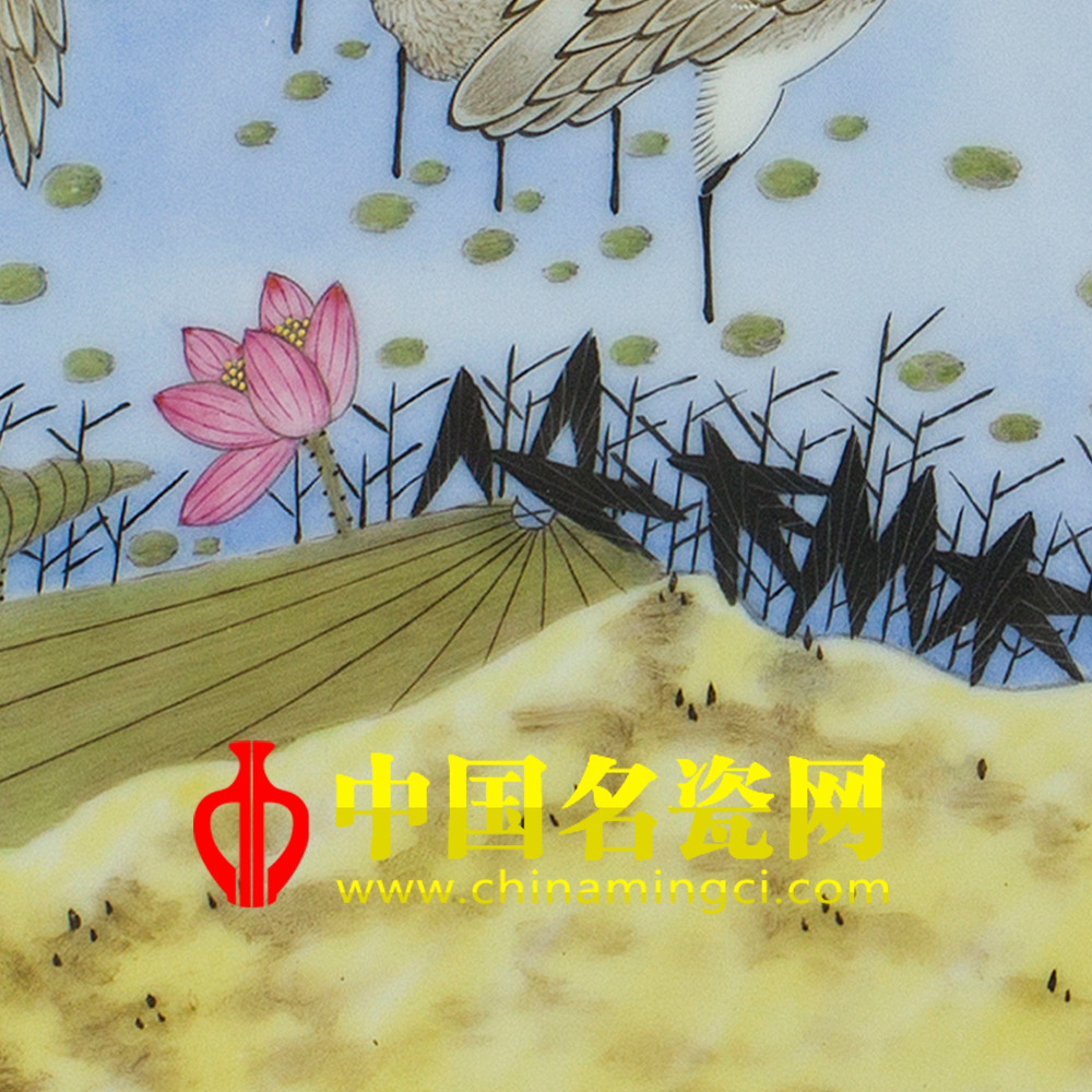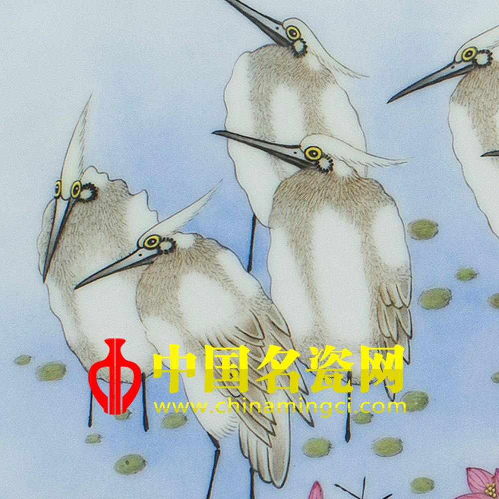 作者在扇形瓷板上,以淡蓝色为背景,表示江河岸边,轻点芦苇影影绰绰,叶随风动,粉嫩的荷花伸出水面,挺立水中,清香袭人,数笔勾勒荷叶洒落水面,别有情调,几只鹭鸶,姿态各异,神情娴静,构成一幅悠闲图,表达了一种超然心,让人有种超然物外的心境。(刘建格)