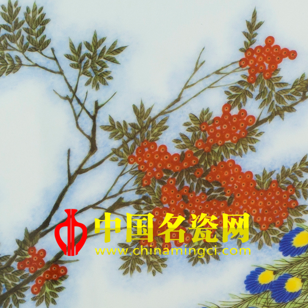 作品绘一孔雀立于灵石之上,灵石皴擦有致,孔雀羽翼华丽姿态自然,孔雀曲颈回头凝望,脉脉含情,优雅高贵之姿完美再现,旁有一簇天竺果果实圆润饱满,色彩艳红似火,与孔雀蓝料之鲜和谐统一,整个画面构图主次分明 ,色彩鲜艳,充满幸福高贵之意。