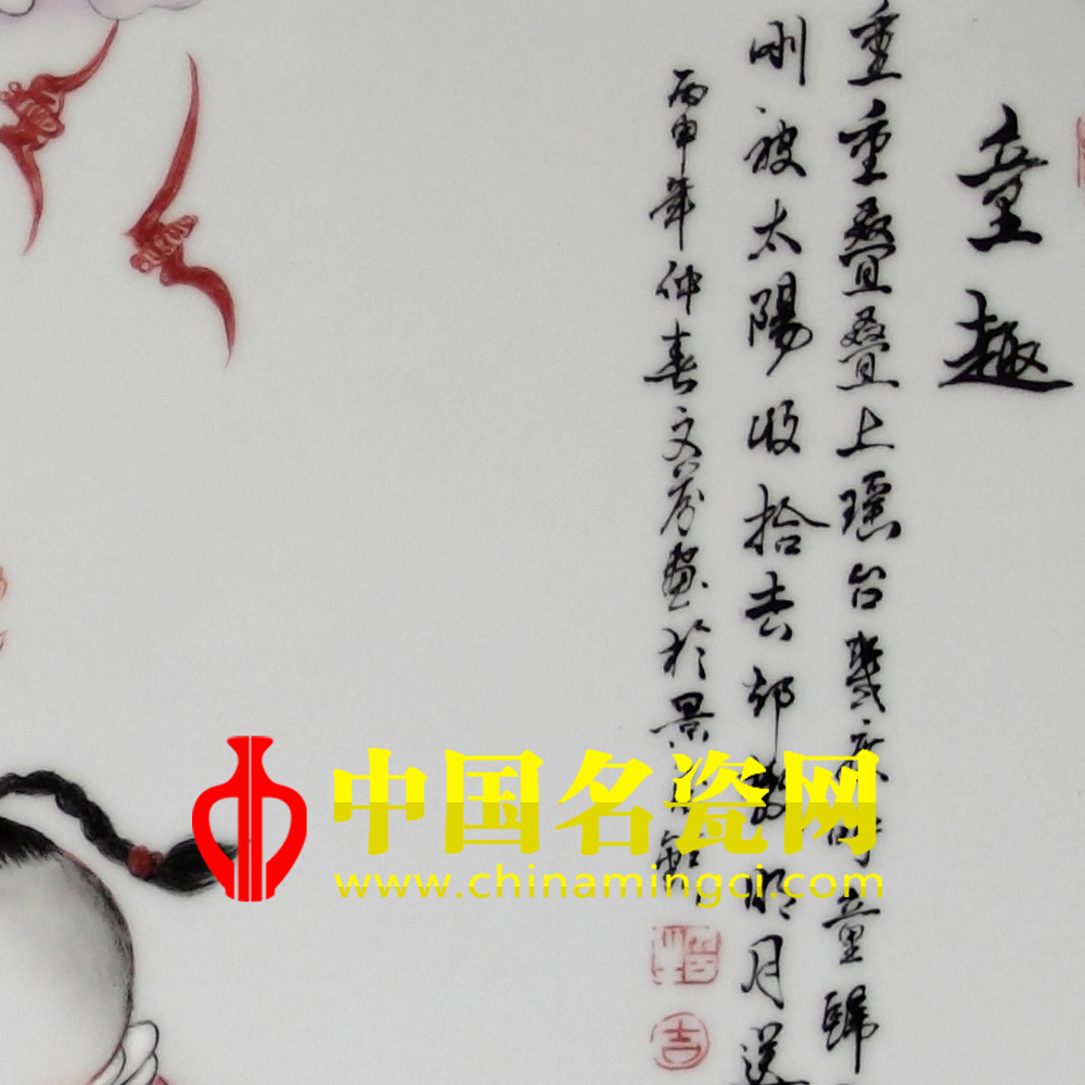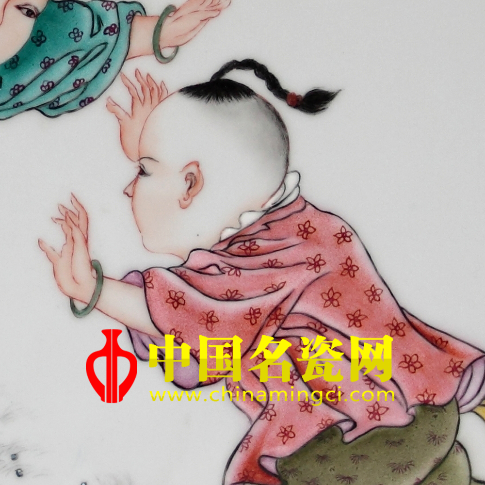 “重重叠叠上瑶台,几度呼童扫不开,刚被太阳收拾去,却教明月送将来。”此作品描绘了几个天真烂漫的童子在瑶台玩耍的情景,画师用独到的审美眼光去发现,用传统的粉彩工艺表现形式,去完美体现了儿童特有的天真和快乐,令人羡慕,更让人感受到了童稚世界的无忧无虑。