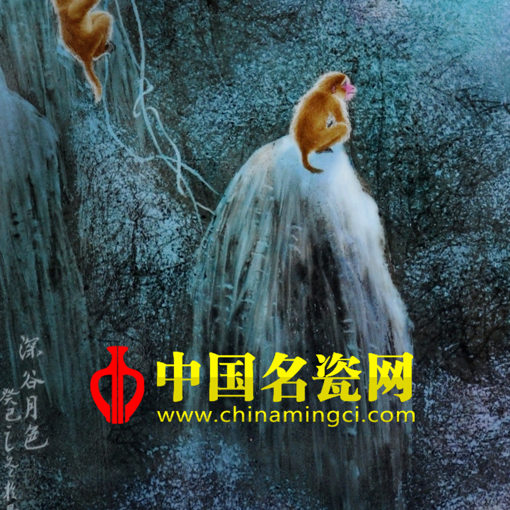 画面表现的是朦胧的夜景,明亮的月光下,几只活灵活现的猴子,在丛林幽谷中玩耍,有的登高望远,有的摇首观望,下面溪水潺潺,作者用逆光的绘画技法,却把山石的厚重感,山谷的空灵感刻画的非常完美,设色明艳而不俗,是具有代表性地佳作。