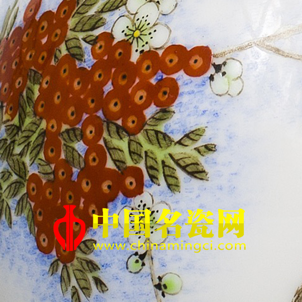 作者在精致的壶型上绘一枝白梅贯穿整个画面,一簇天竺果颜色通红,饱满圆润,两者相互映衬,白的淡雅,红的鲜艳,中部以留白为主,一只麻雀,展翅飞翔,灵动自然,整个画面寓意喜悦祥和,情趣盎然。(刘建格)