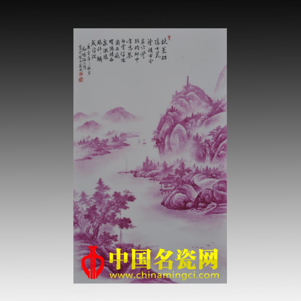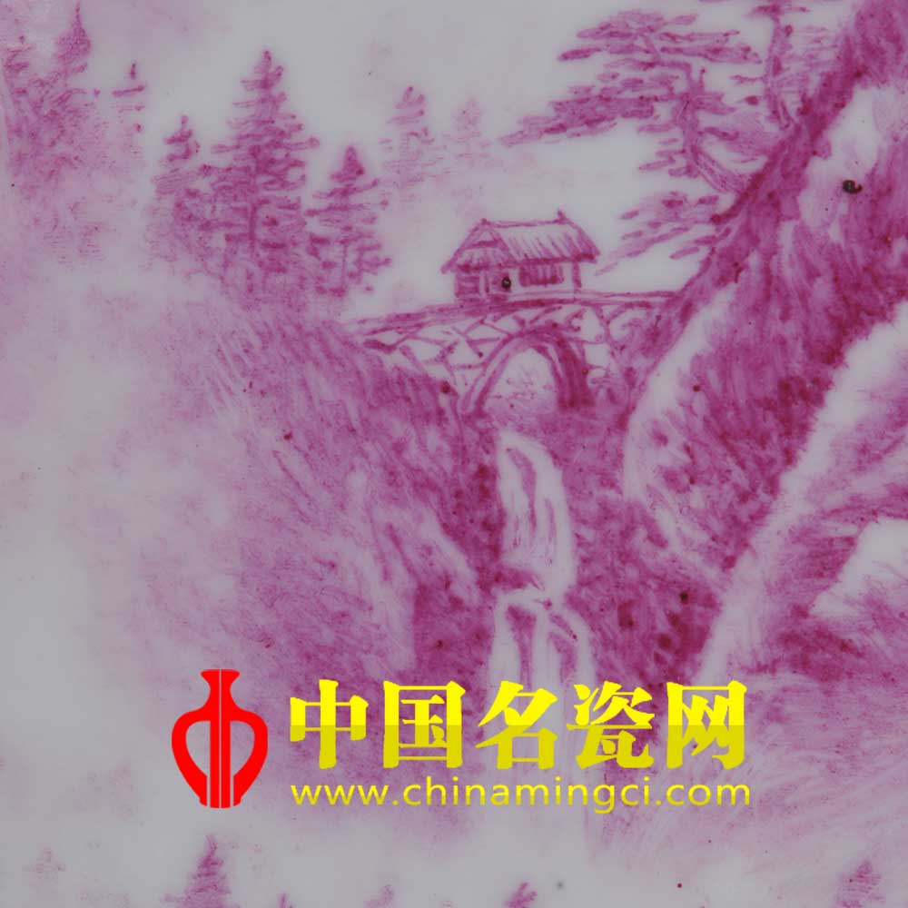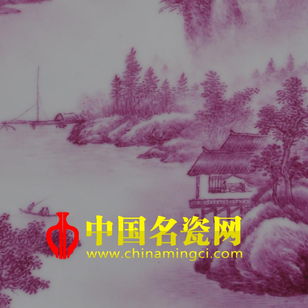 此图采用平远式构图,层次分明,在山川、河流、云岚、茂树的大场景中加入了人物、楼台、船帆等人物气息,表现了自然生活的安静清新,用玛瑙红装饰技法表现山水,重在追求中国画的意境,别有一番韵味。玛瑙红产生的绚丽视觉效果,使整个画面带给人感官的震撼。