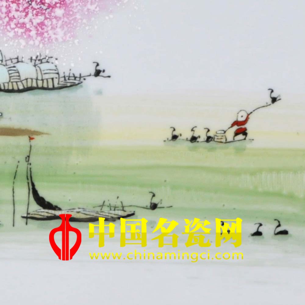 这幅作品描绘了江南早春的景色:远景桃花灿烂,似云蒸霞蔚,具有浓郁民族风情的居民隐于桃林之中;广阔的湖面上,绿光微微,不禁会让人联想到“春来江水绿如蓝”的诗句,两支渔船摇曳在水面上,那份悠闲不言而喻。