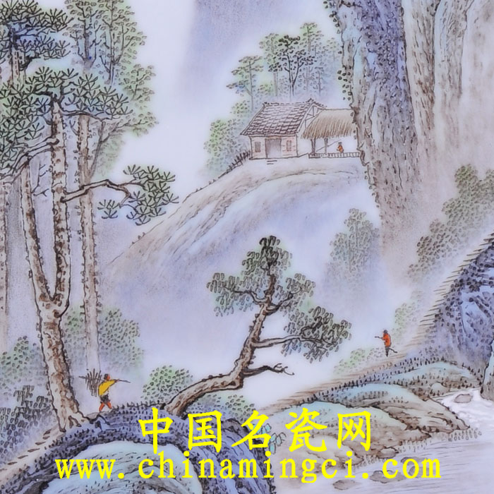 作品中,层峦吐翠、峰峰相连,或峭拔陡峻,或奇壑突兀。其近山凝重,远山虚淡,相互衬托,景致奇妙;峡谷中湍流淙淙,飞流而下,至山脚处渐次开阔,形成溪水,沿山隈而缓行;溪水涟漪清澈,滟潋旖旎,明如澄月,朗如琼瑶;溪水莲畔,树木蓊郁,山石起伏,有茅舍农屋隐露其间,农夫负薪欲踏栈桥归牧。作品笔墨工整细秀,自如流畅,设色淡雅,层次丰富,充分显示其山水画缜密清润的艺术特色和个性风格。就陶瓷山水装饰形式而言,有汪野亭青绿山水之秀,又有汪大沧秃笔山水之野,画师融二者之长自成一格,是谓难得。(张青)