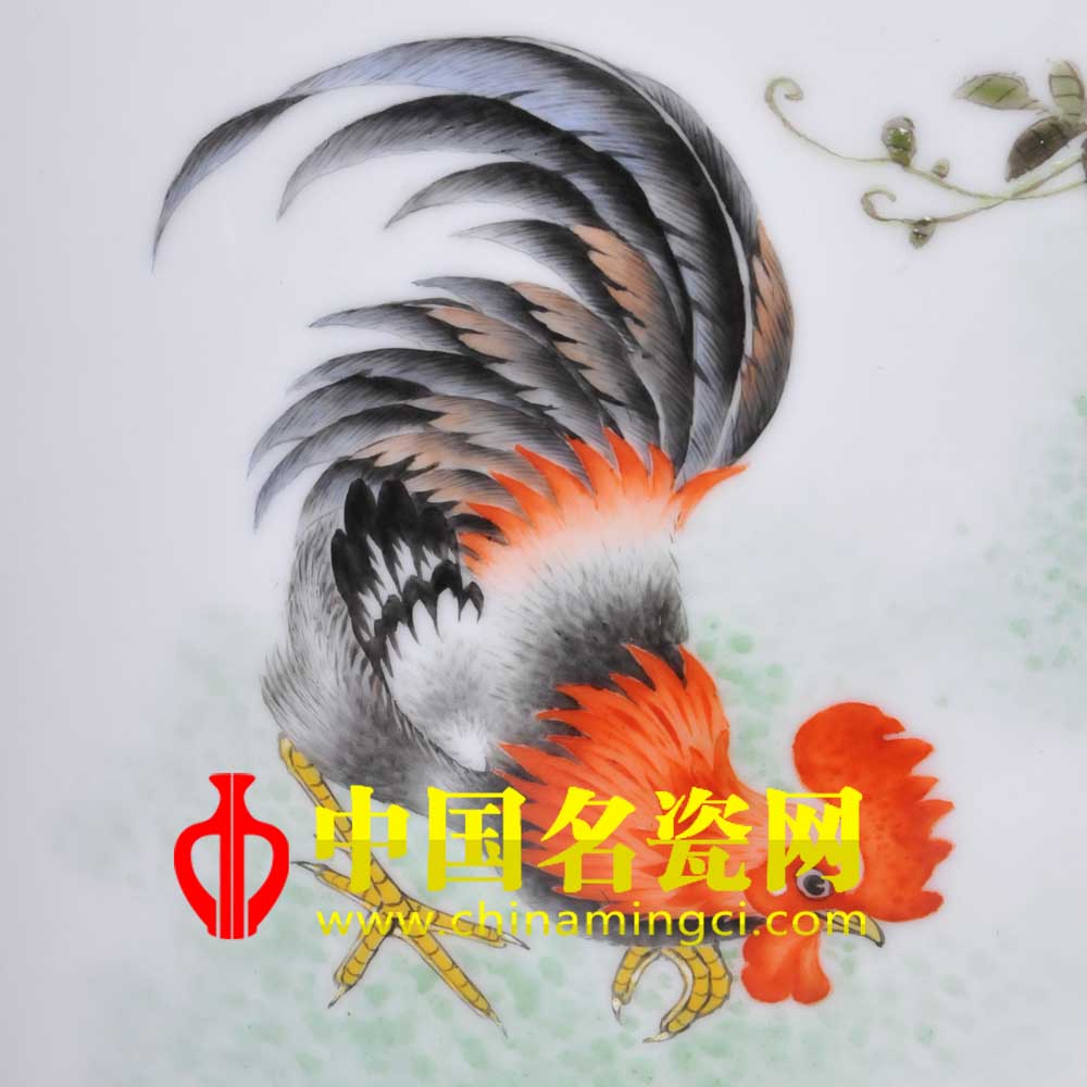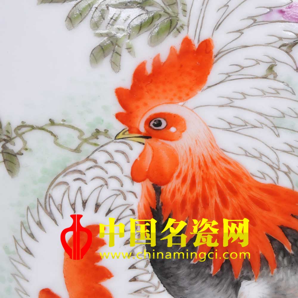 李白有诗云:“紫藤挂云木,花蔓宜阳春,密叶隐歌鸟,香风留美人”,这暮春时节,也正是紫藤吐艳之时,作者因器施画,运用水点技法将紫藤表现的淋漓尽致,一串串硕大的花穗垂挂枝头,散发阵阵清香,灿若云霞,枝蔓如龙蛇蜿蜒,正可谓“紫藤缘木而上,条蔓纤结,与树连理,有若蛟龙出没于波涛间”,花下三只五彩羽衣的雄鸡,一只昂首若有所思,另两只见一蝈蝈,争相觅食,雄鸡蓬松的羽毛极富真实感,蝈蝈虽小却为点睛之笔,使整幅作品信添生趣,三只公鸡为“三公”与古代“三公九卿”同言,喻高官显位。