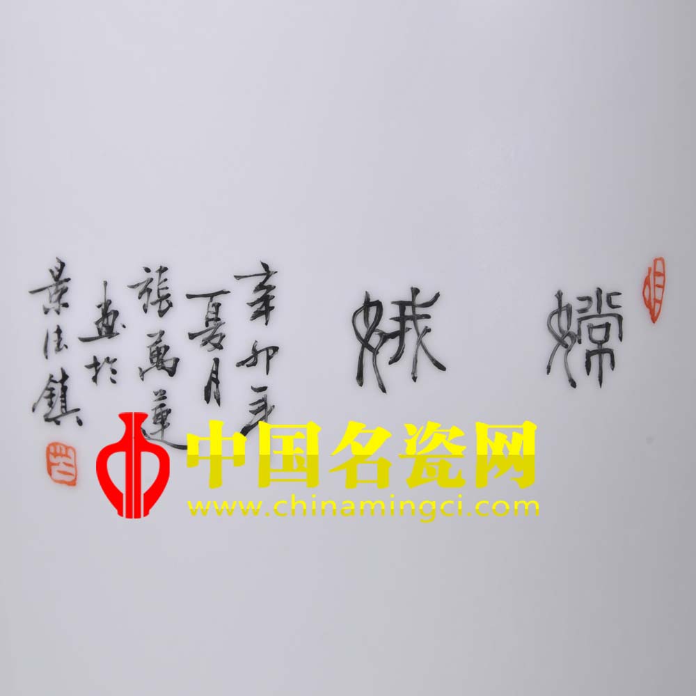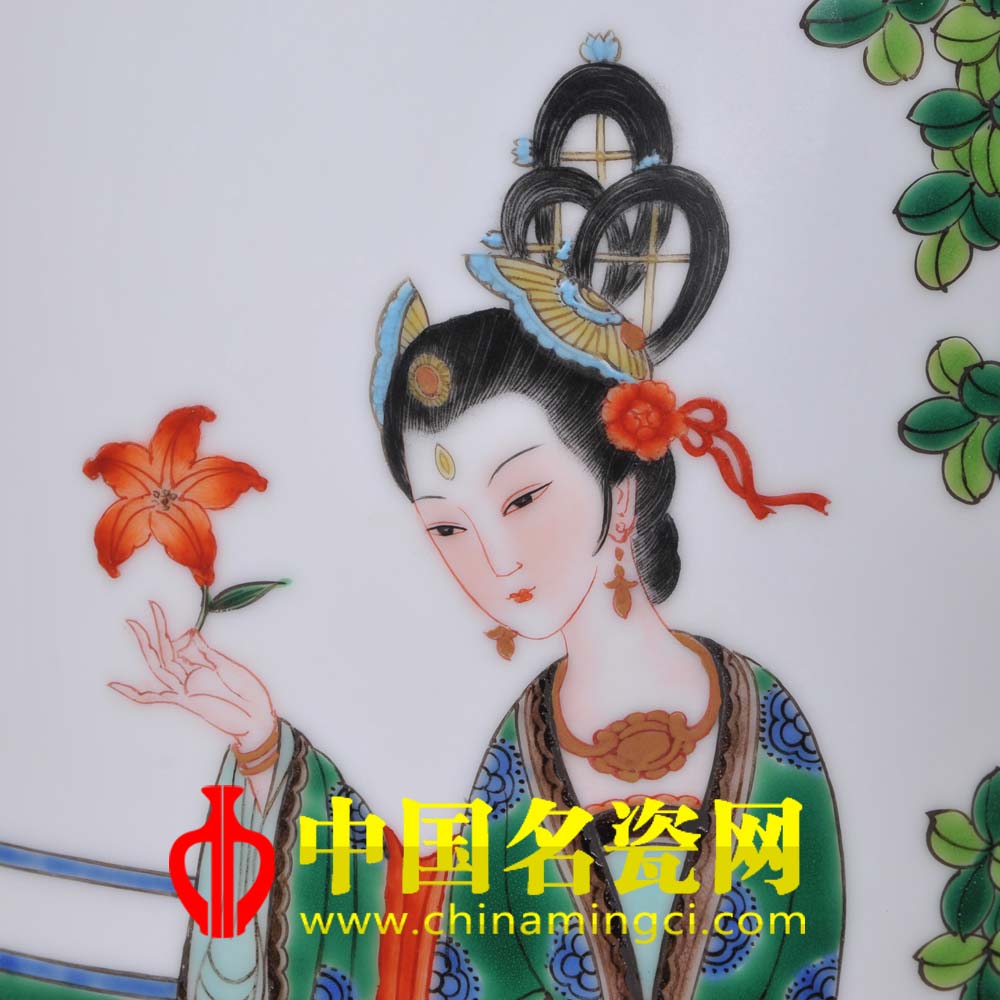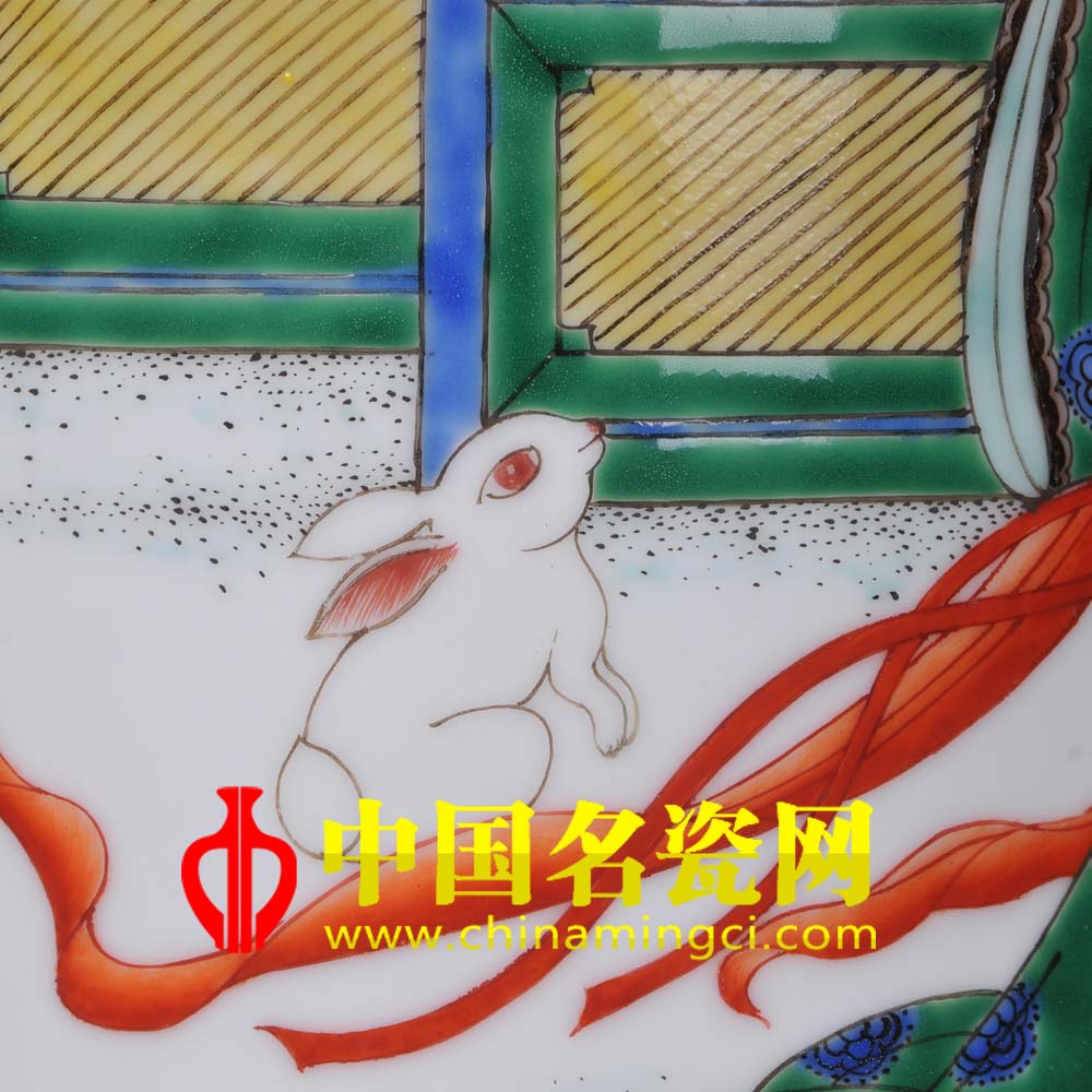 古彩“美在大红大绿,妙在古香古色”,红绿搭配,艳却不俗。画面中以古彩描绘的嫦娥,面容俊俏,脸色红润,低头不语,似在思索着。纤纤玉指拈着落下来的红叶,似以红叶传情。高大的枫树与树下的嫦娥巧妙的构成一幅人间不曾见的美景,“月宫秋冷桂团圆,岁岁花开只是攀。共在人间说天上,不知天上忆人间。”大概正应此景吧。