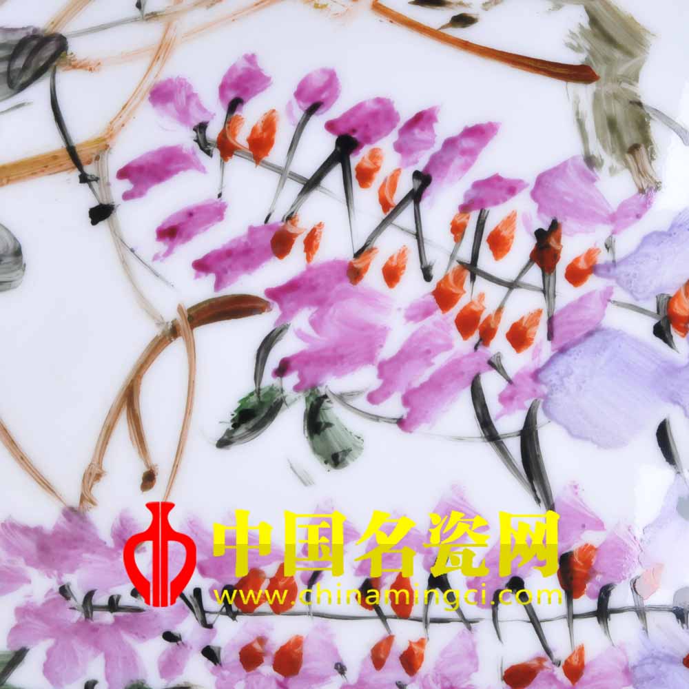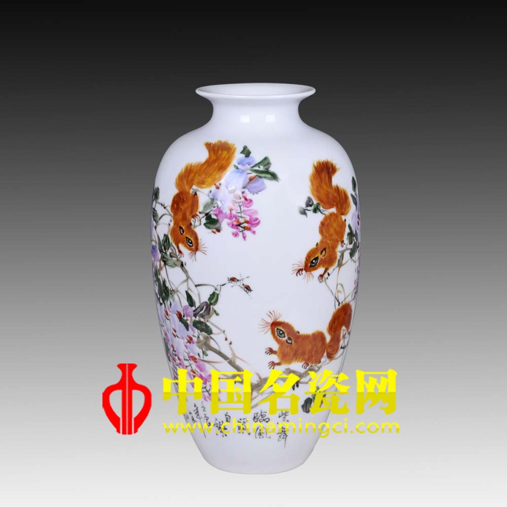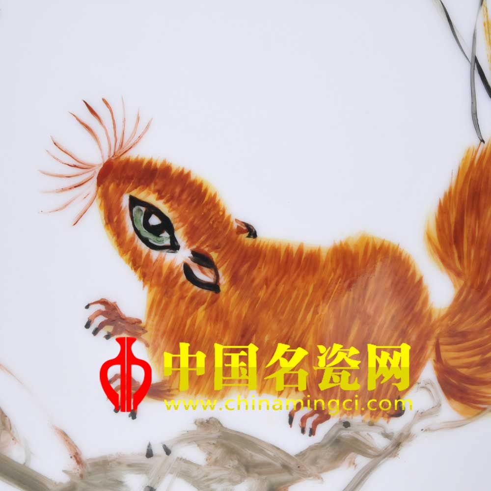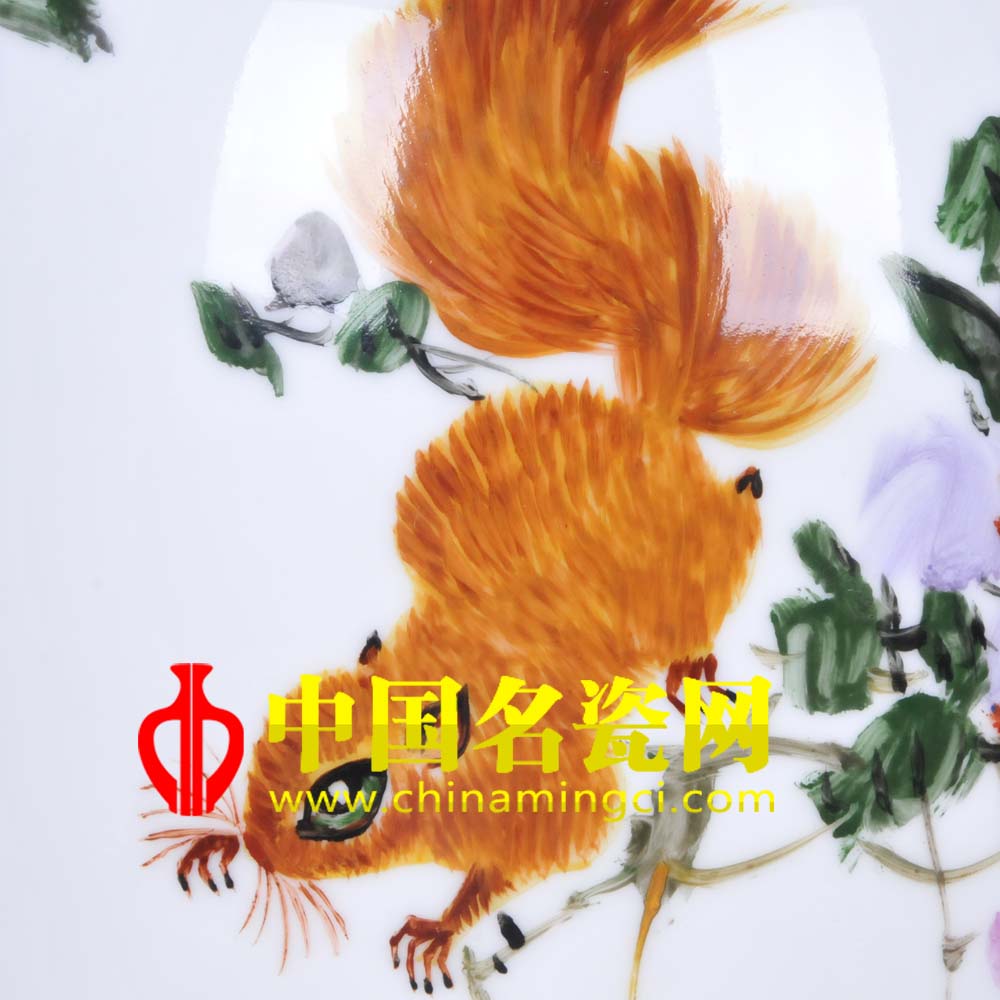 作品描绘三只松鼠嬉戏于藤蔓间,其鼠纯用棕黄色垛染烘晕,妙笔绘成,形出灵鼠浑然天成的质感。尾毛的粗与嘴须的细,紫藤的纤枝与灵鼠的轻巧共同塑造了一幅风轻鼠乐的和谐美景。三只灵鼠姿态各异,眼睛灵动水润,尾部轻扫藤蔓,嬉戏游乐。朱正荣老师将松鼠的灵动与藤蔓的绮丽完美的融合于瓶身上,描绘了灵鼠临风嬉戏的欢乐场景,和谐之情,隽永之意尽在瓷瓶之上,可见朱正荣老师的技艺之高深。(阳贝贝)