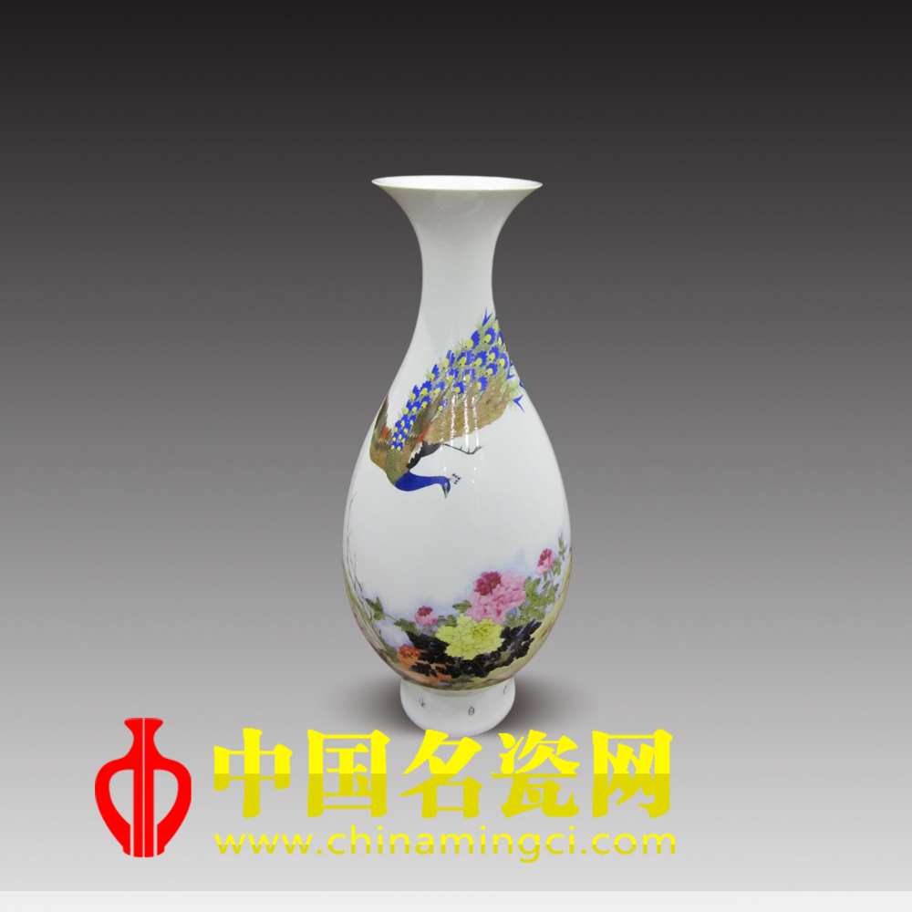 作品绘于传统器形琵琶瓶,线条柔和、形态优美。上端工笔状绘孔雀,姿态自然而用笔流畅;下端写意的牡丹竞相争艳,枝叶浓淡点缀其间。其擅长的黄石贯穿整个画面,增添了色彩,完整了构图。“惟有牡丹真国色,开花时节动京城”,色彩斑斓、艳丽无比的孔雀似乎也被牡丹的国色天香吸引,盘旋而下。无论是构图立意、勾线设色还是题材选取、材质运用上,都有一种承继中有创新的笔踪墨韵。