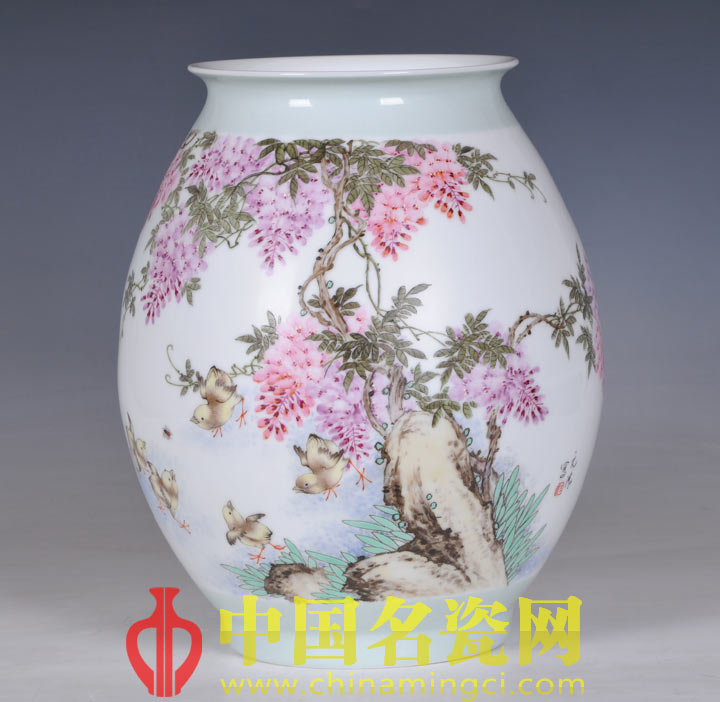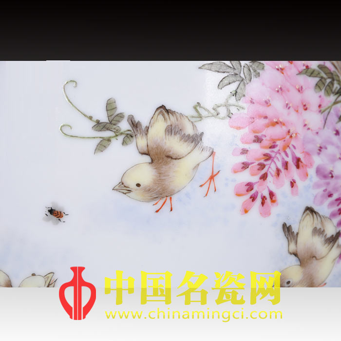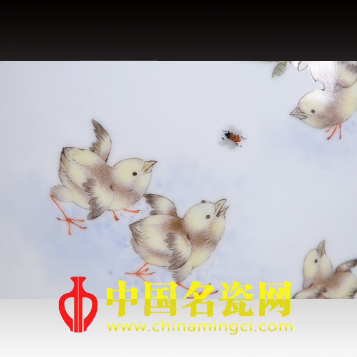 作品将水点技法发挥到淋漓尽致。绘春日清丽紫藤摇曳之态,形成上密下疏的布局。枝蔓随势生长,向各个方向延伸,巧妙地调整了画面的重心。前景古拙树干,青草环绕,树下几只小鸡嬉戏玩耍,淡黄绒毛温软可感,张翅做扑蜂态,可爱至极。瓶身颈、足处以青釉装饰,细节处更添雅秀味道。作品构图新颖,典雅细腻,生活气息浓重,充分显示了彭元清老师高超的瓷作造诣。(姚云朵儿)