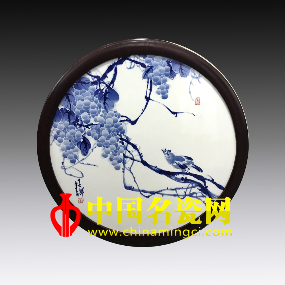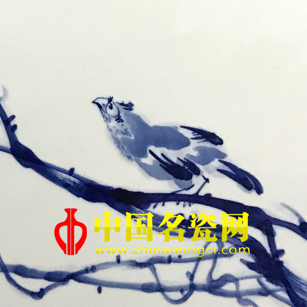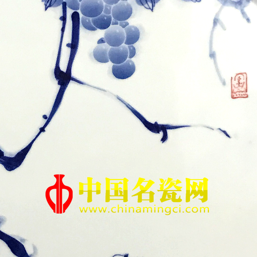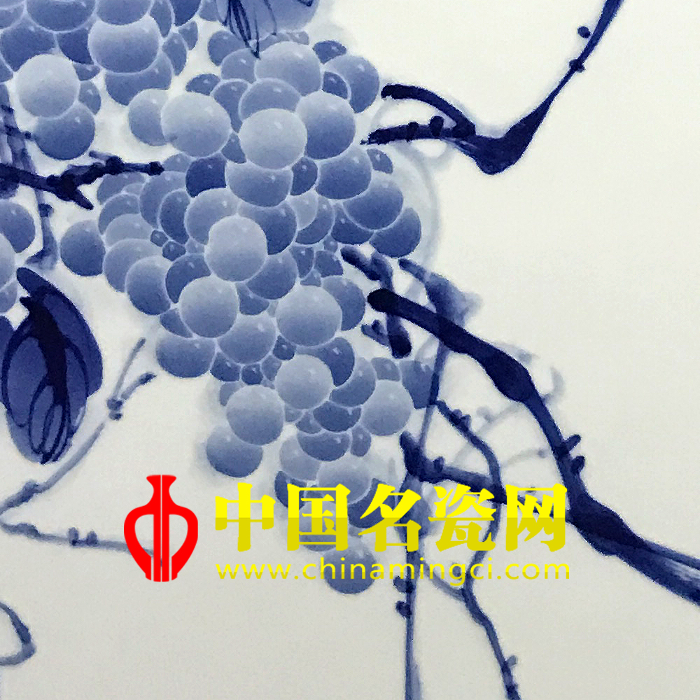 此作品中国画构图,大写意花鸟,独特气质,画面藤蔓弯曲而下,遵劲自然,以浓墨挥洒,点叶勾边,藤叶错落有致,筋络清晰且舒展自如,藤叶之间硕果累累悬挂其中,青翠欲滴、晶莹剔透,一只八哥栖息藤干上使之趣味盎然。王辉的青花笔法写意,章法洗绮,心法自然。(宿亚兰)