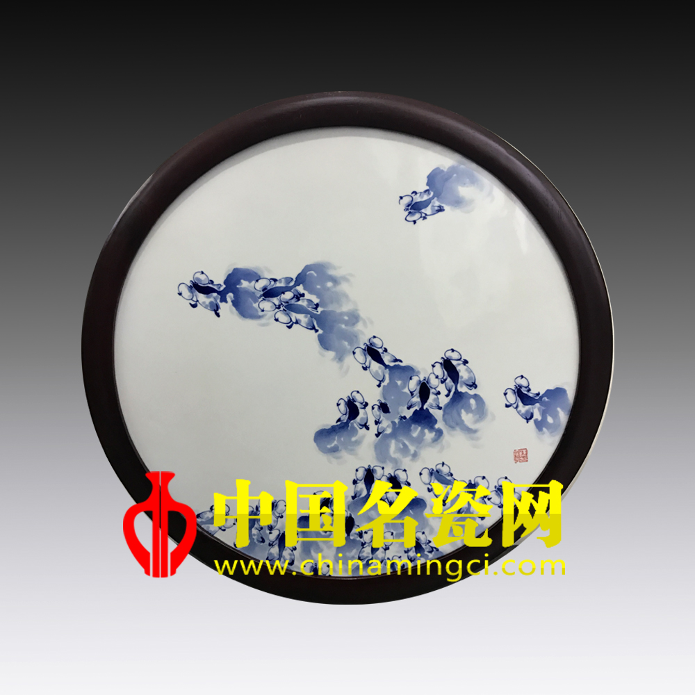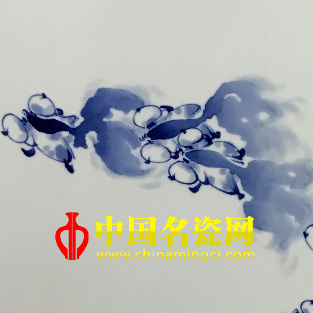 此作品以圆板作画,画面构图简约,上疏下密,写意描绘,金鱼由右下沿圆板边缘向左上游动,鱼态优美,虽无波涛潋影,但舒展行鱼,恬静中透出生机,悠然中充满活力。画师运用其独特的装饰手法,青料水晕墨彰,纯净明澈,充分的传达了所要表现的意蕴。(宿亚兰)