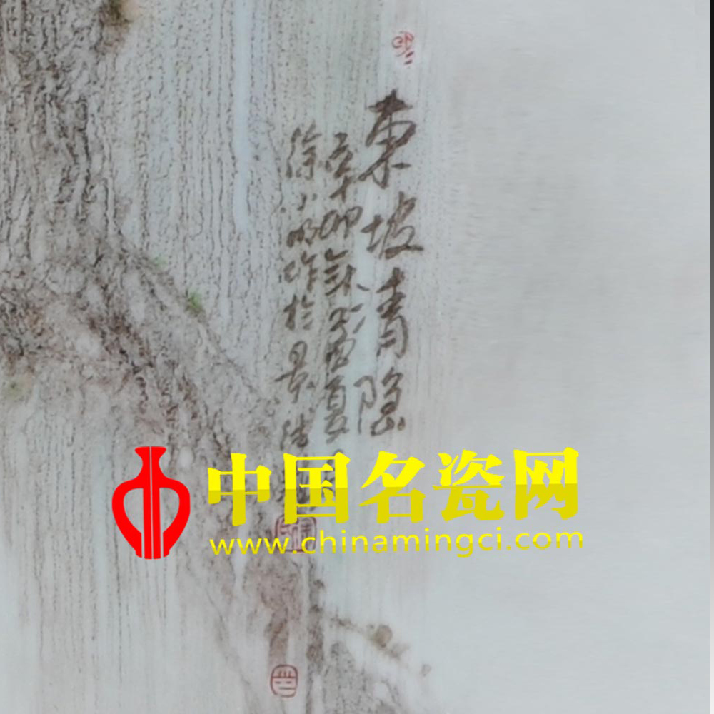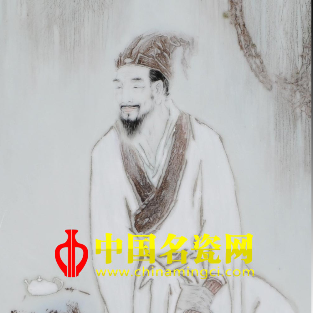 作品以古雅清秀的笔法绘北宋文豪苏东坡于柳下伴茶闲读的情景。画面注重意境的表现,其擦豪为茵、渍墨成石,简约的线条勾勒出人物悠然的坐姿,泰然的表情更表现出人物内心平静闲适的境界。石上一壶清茶,空中细柳如烟、用墨不多,而意蕴全有。秀逸的笔锋和古雅的墨韵浑然天成,满腹经纶、儒雅稳健的人物形象跃然瓷上。徐小明老师深厚的国画功底可窥一斑。