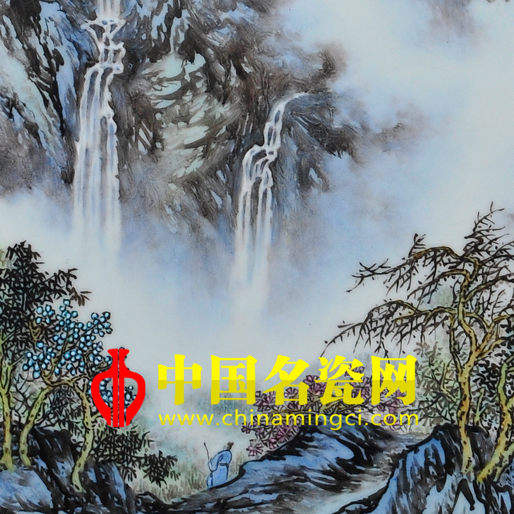 作品描绘了,高山、古松,飞瀑等山中之最。远山在浮云中层层叠起,如梦如幻,中景山势陡峭,几挂飞瀑顺山势而下,聚为溪水,蜿蜒流向远方,一老者策杖而立,静观飞瀑,松树错根而生,枝繁叶茂,伴随着潺潺水,诗情画意油然而生。作品布局稠密,笔势纵横,墨色浓淡有变,浑然一体。(刘建格)