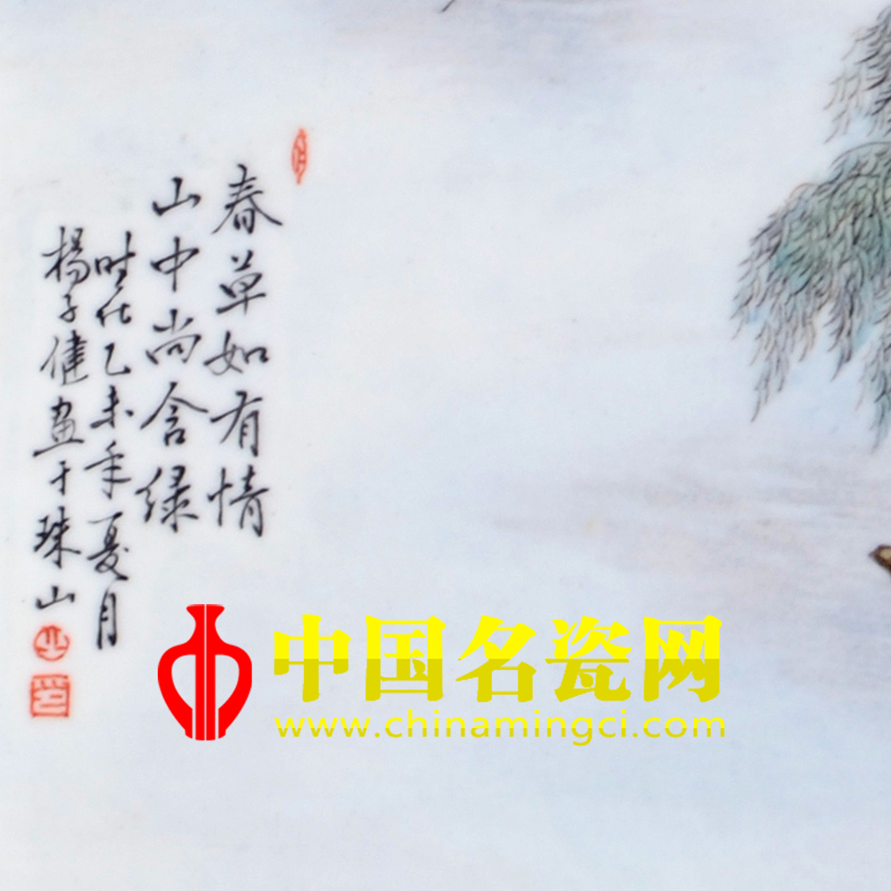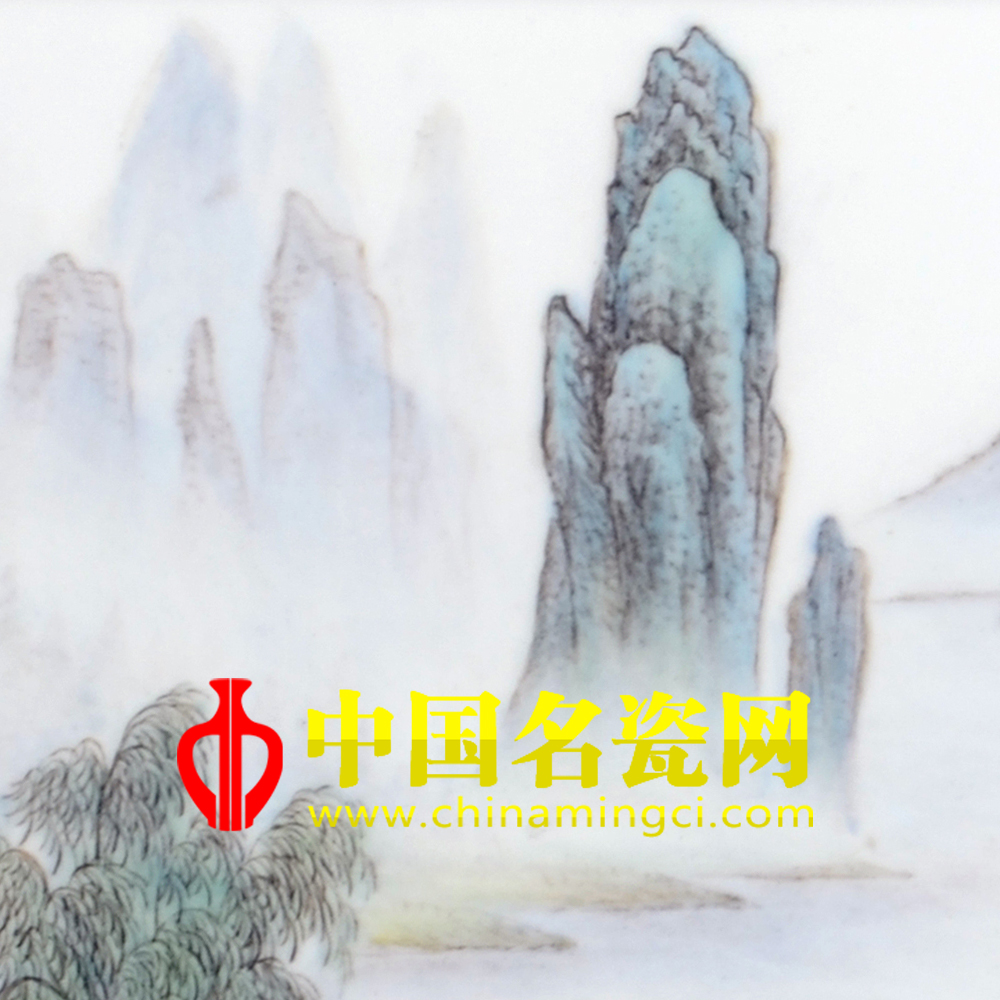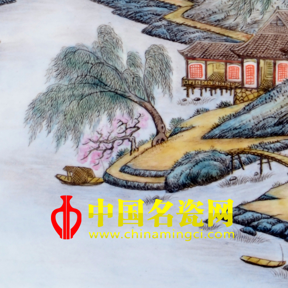 此图根据瓷板画的展面施画,其春光明媚,湖水潋滟,绿荫覆地,山树吐翠,远山缥缈,朦胧奇逸秀丽,使人心旷神怡;其间舟影点点,野径曲曲,那远景的湖水上方云雾缭绕,村舍山间若隐若现,使画面构图饱满而层次清晰。画师笔势细秀劲健,勾勒灵妙,足见构思巧妙寓意高古。