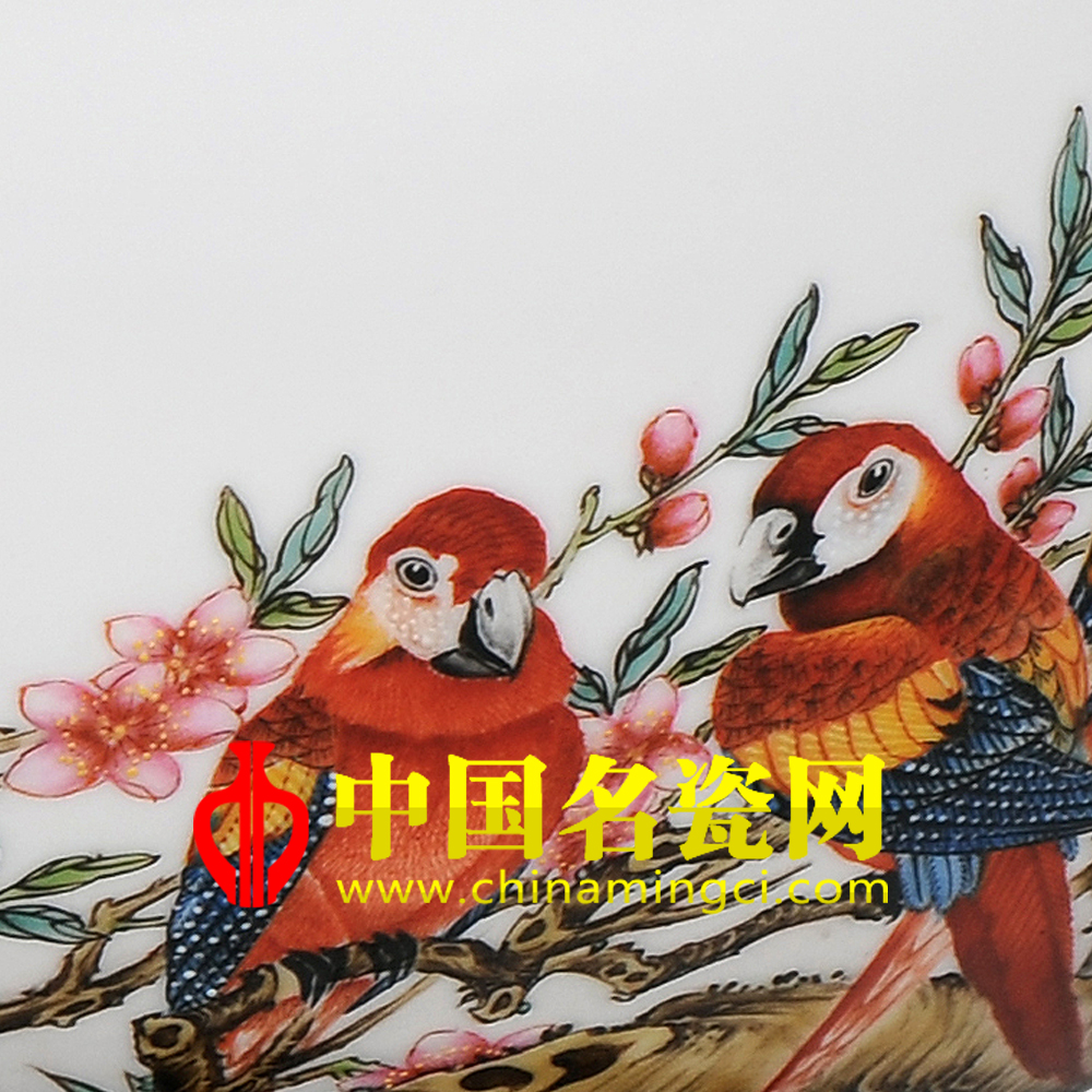 画师以工笔秀润的笔致描绘初春生机勃勃,鸟语花香的景象,画面中红色碧桃花,花开正浓,枝干苍劲古拙,清媚自然,桃枝之上,嫩叶萌生,枝叶之间花瓣怒绽,四只鹦鹉悠然栖立,或振翅欲飞,或敛翼欲停,动态可掬。整图色墨交融,敷彩缤纷,笔势流畅,天趣飞扬。(刘建格)