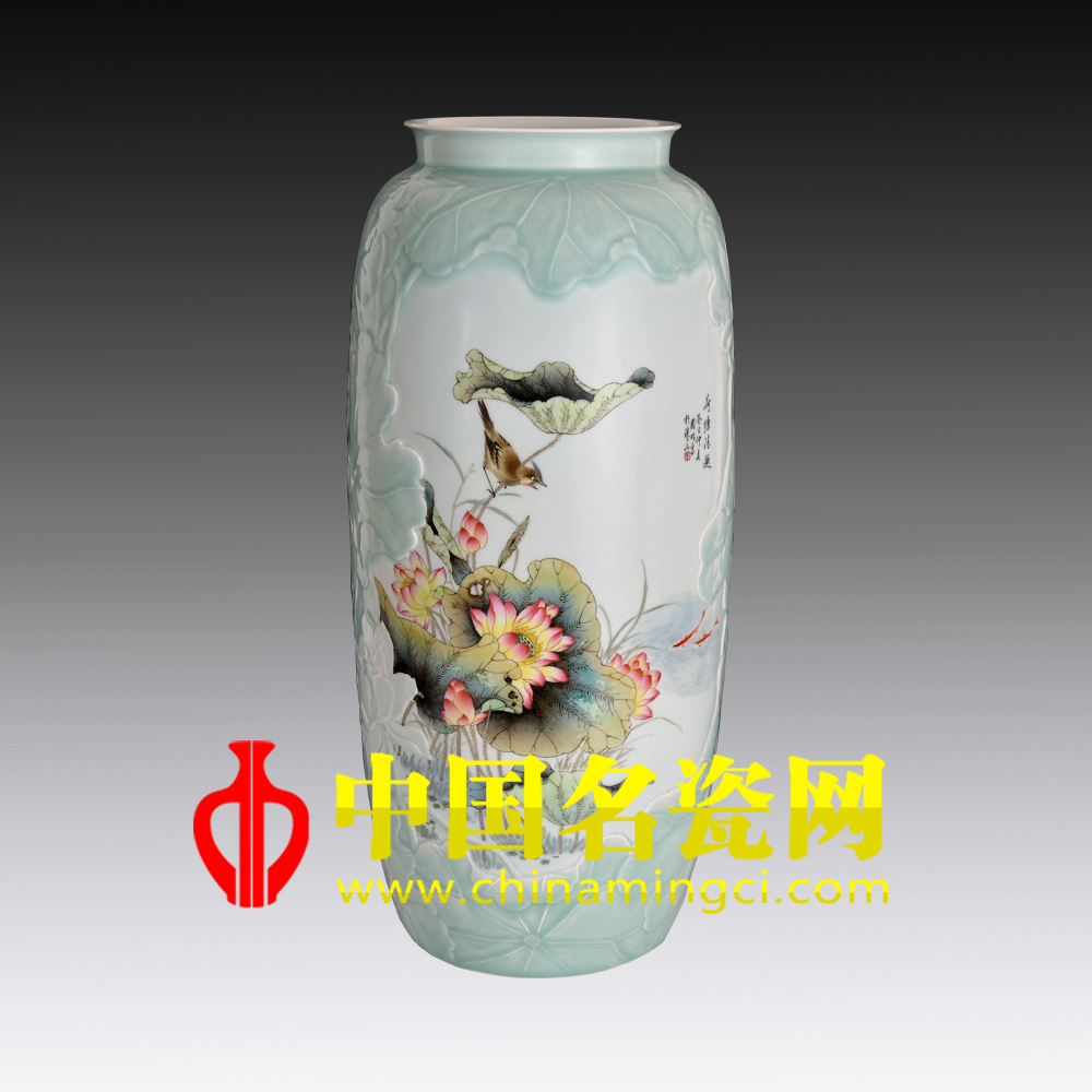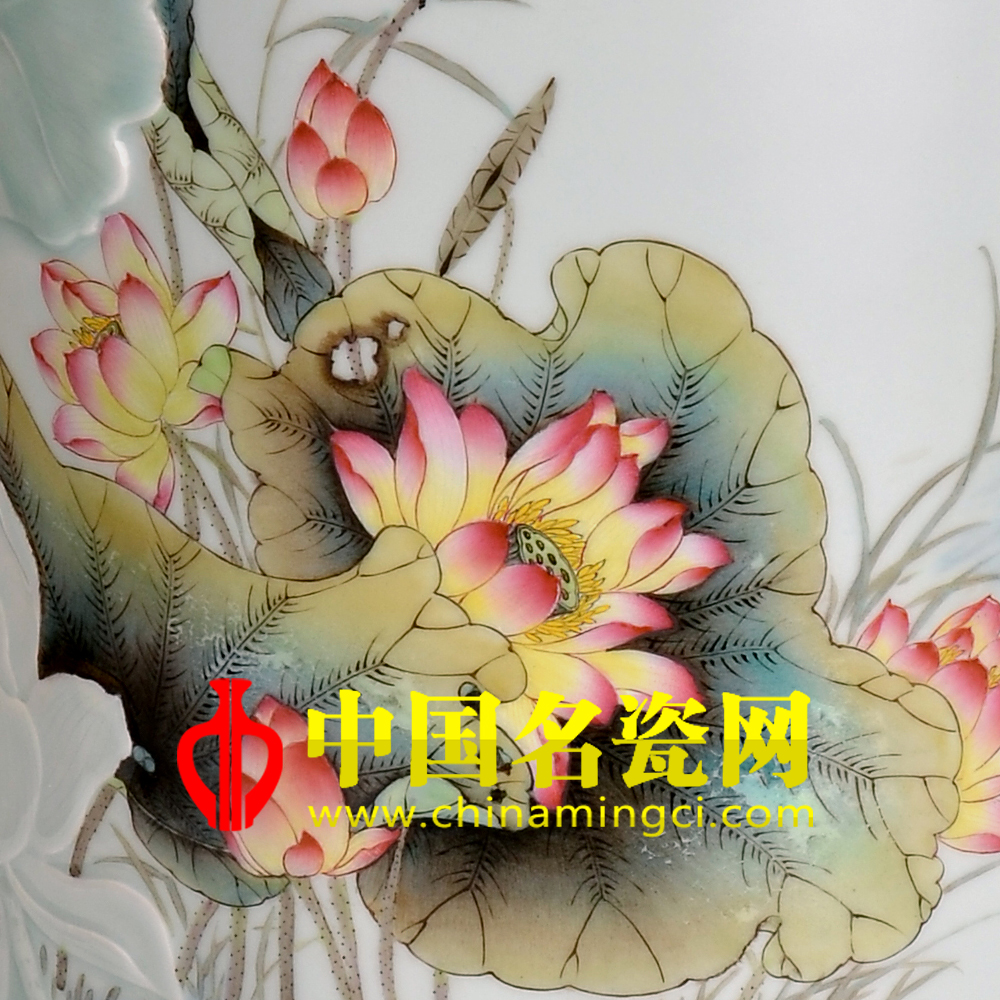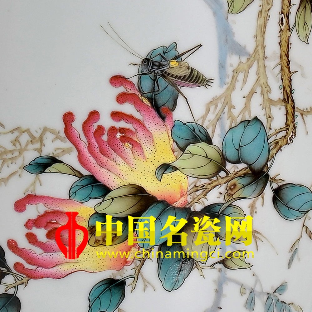 瓷瓶为影青雕刻荷叶纹饰开光直筒瓶,丰腴优美,画面依瓶展开,荷花宛立水中央,荷叶硕大肥美,青翠欲滴,荷叶托起莲蓬和荷花,粉嫩鲜艳,姿态优雅,一只翠鸟立于荷茎之上,顾盼生情,微风掠过,激起阵阵涟漪。另一面构图上疏下密,绘制佛手和蝈蝈,色彩鲜艳,寓意美好。整个画面构图恬简,比兴盎然,手法高妙,极见功力。(刘建格)
