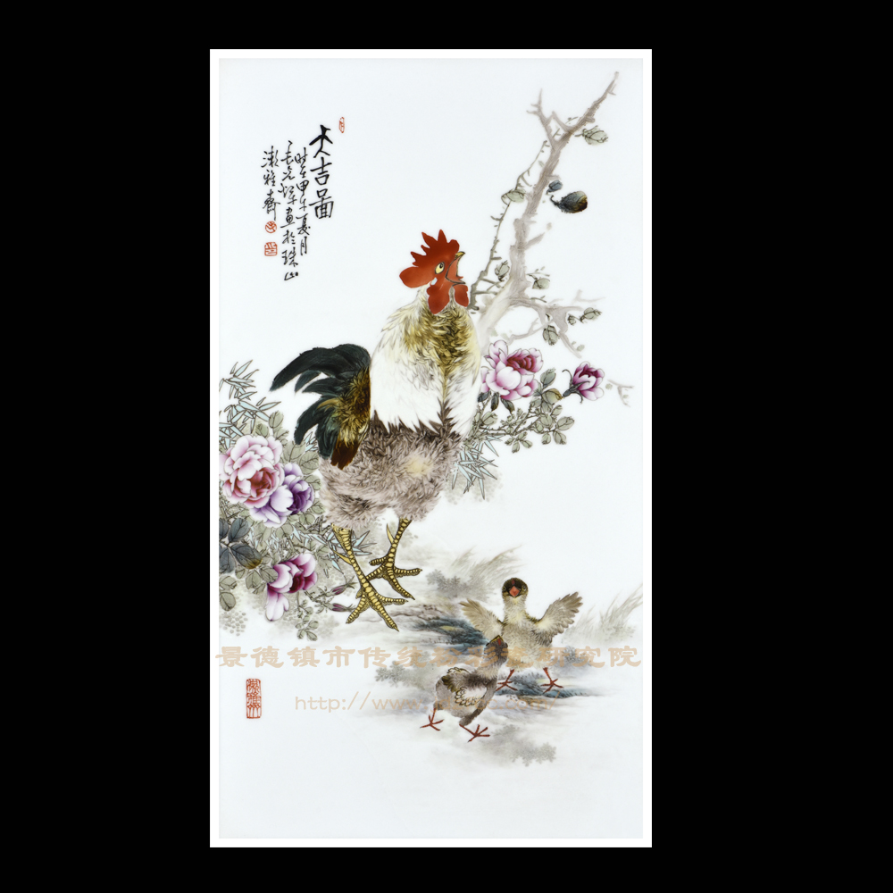 毛光辉此作布局疏密有致,左上虚,右下实,中间的公鸡为全幅点睛之笔。以其细腻的笔触将公鸡的鲜活动态描绘了出来,右下展翅而啼的小鸡更是突出了整幅画面的生活趣味,整幅作品的自然生命力跃然瓷上。