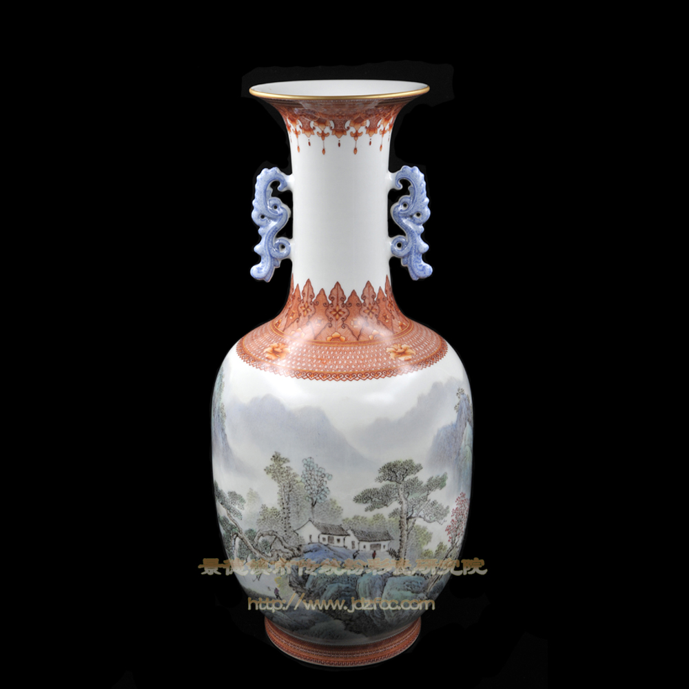 此双耳瓶造型规整,纹饰精美,柔和淡雅。作品工艺精致,构图得体,色彩淡雅,豪放中不失婉约,沉静中透出洒脱,大气中不乏精妙。既揭示自然生活之美,又表现出了对生活的向往之情。